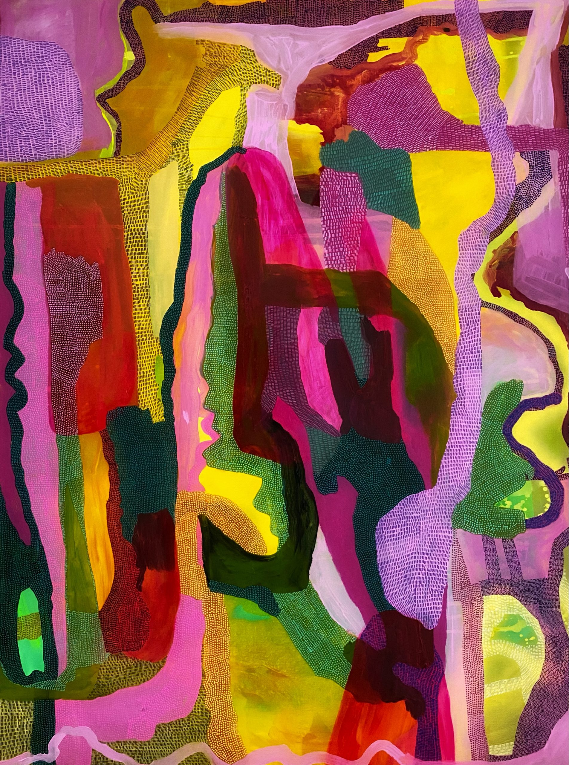 This work was created by building layers of medium. First, ink washes and acrylic glazes then spray paint and acrylic paints. Finally, there are layers of intricate pattern and mark making. This final layer is done to both contrast and compliment the paint layers. Due to this layering technique, this work has an incredible amount of depth, with various areas under-painting visible. It is a bold, statement piece with vibrant areas in multiple shades of pink and green. These are complimented by warmer areas of orange yellow and violet. As such, this work is contemporary yet very livable and would suit a varied range of interiors and tastes.