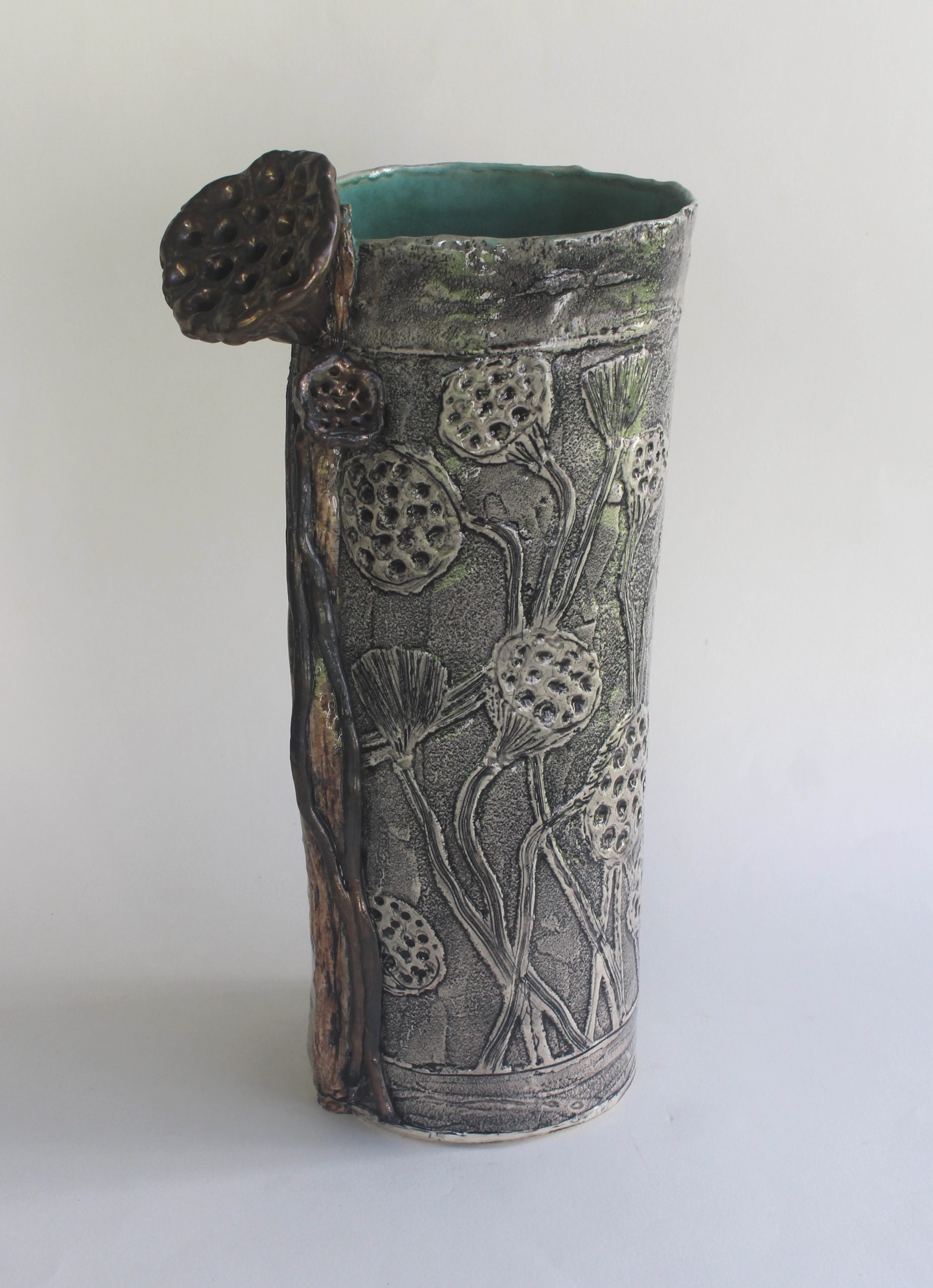 One of my favorite pastimes is to go walking in the forests and gardens where I live. I pick up bits and pieces of twigs, seeds and other items that have fallen to the forest floor. On taking them back to my studio I make latex moulds to use in my landscape pieces. This vase started as a sketch, a stencil was then cut before screening tiler’s glue through the stencil. Clay slabs are rolled onto this textured surface and then assembled. After this I add the clay twigs, seeds and hand moulded additions before colouring and glazing. Please note: The green tinge on the outside of the vase is a light reflection on the glossy surface. There is no green on the outside of the vase.