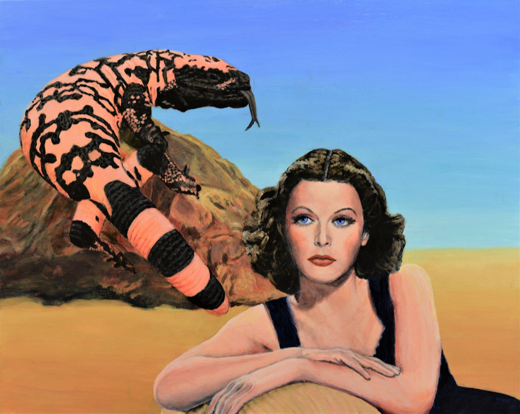 Lounge Lizard. Original Surreal painting on high quality canvas measuring 61cm x 76cm x 3.8cm. Painting is ready-to-hang and features Hedy Lamarr, retro 1940s Hollywood movie star with a giant Gila Monster lizard in the background, creating a surreal and unsettling atmosphere. It seems out of place which creates a puzzle for the viewer to solve. The inspiration for my paintings is the glamour and drama of Hollywood movies of the 1940s and 50s. I appropriate and transform the black and white publicity stills from the films by painting them in arbitrary colours, and often placing them in incongruous and sometimes bizarre settings such as in rainforests, caves, deserts, ancient tombs, bushfires, or with exotic animals such as snakes, macaws, leopards, tigers, lizards, and spiders. My paintings are created using acrylic paints, gels and mediums and often have interesting textures and a glossy or metallic surfaces. Invest in an up-and-coming artist. I have been finalist for all the major Queensland prizes for the past few years – Lethbridge 10,000, Rotary Art Spectacular, Moreton Bay Art Awards, Noosa Art Award, Stanthorpe Art Prize. I have also exhibited at various Brisbane and Gold Coast galleries.