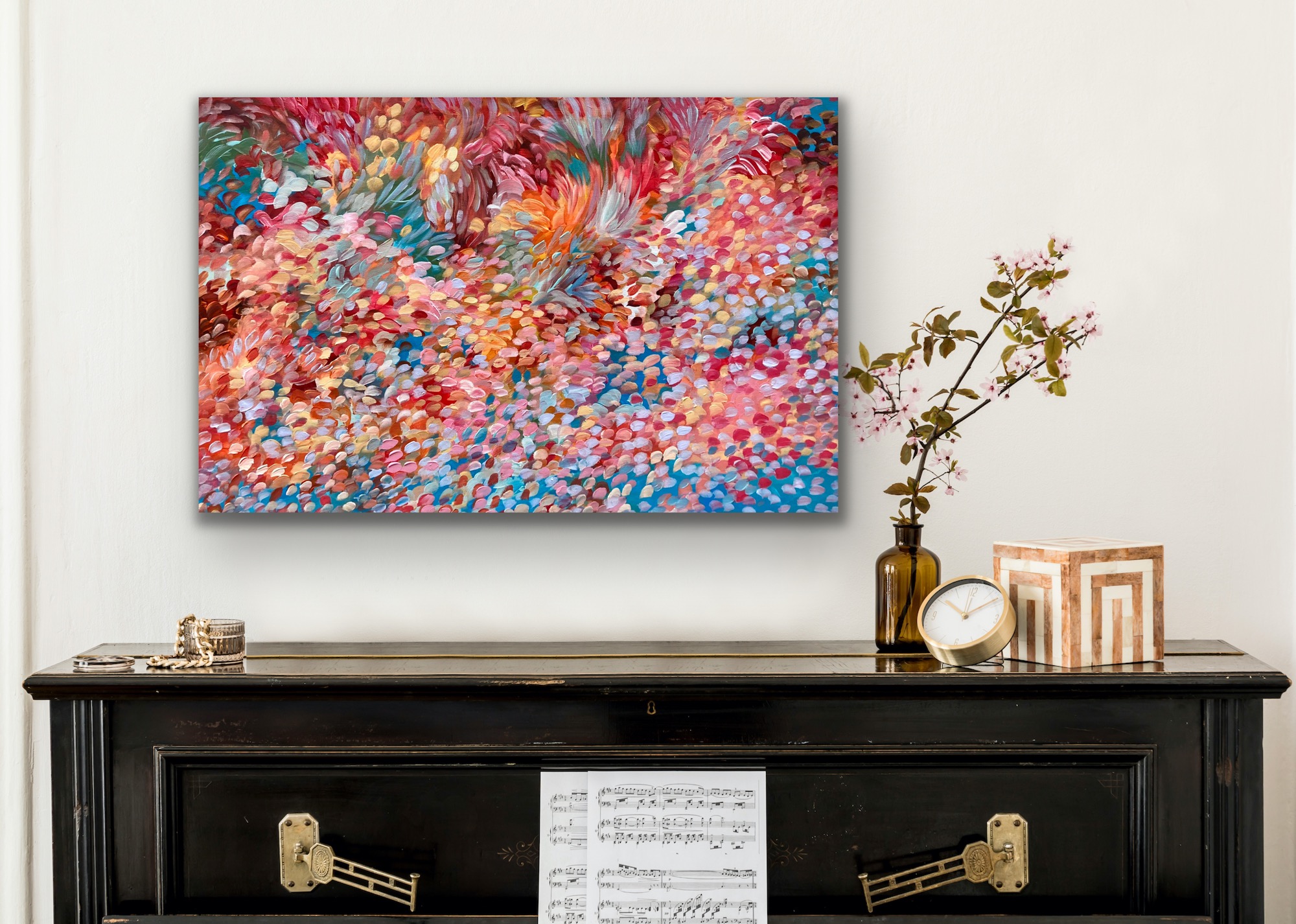 Love and Devotion a painting with lots of layers of colours of petals covering the hills. This is a place you can let your self go and dream and feel peace. The landscape becomes a bouquet of petals dancing over the land. I tried to create this beautiful composition of colours of the landscape and creating so much depth to the painting . Capturing the beautiful colours of the petals, foliage of the trees like musical notes dancing over the landscape weeping over the lake. The Forest comes to life with lots of rhythms and sounds of the petals. A very peaceful and tranquil painting. The painting is signed and dated 2021 at the back and comes with a certificate of Authenticity.