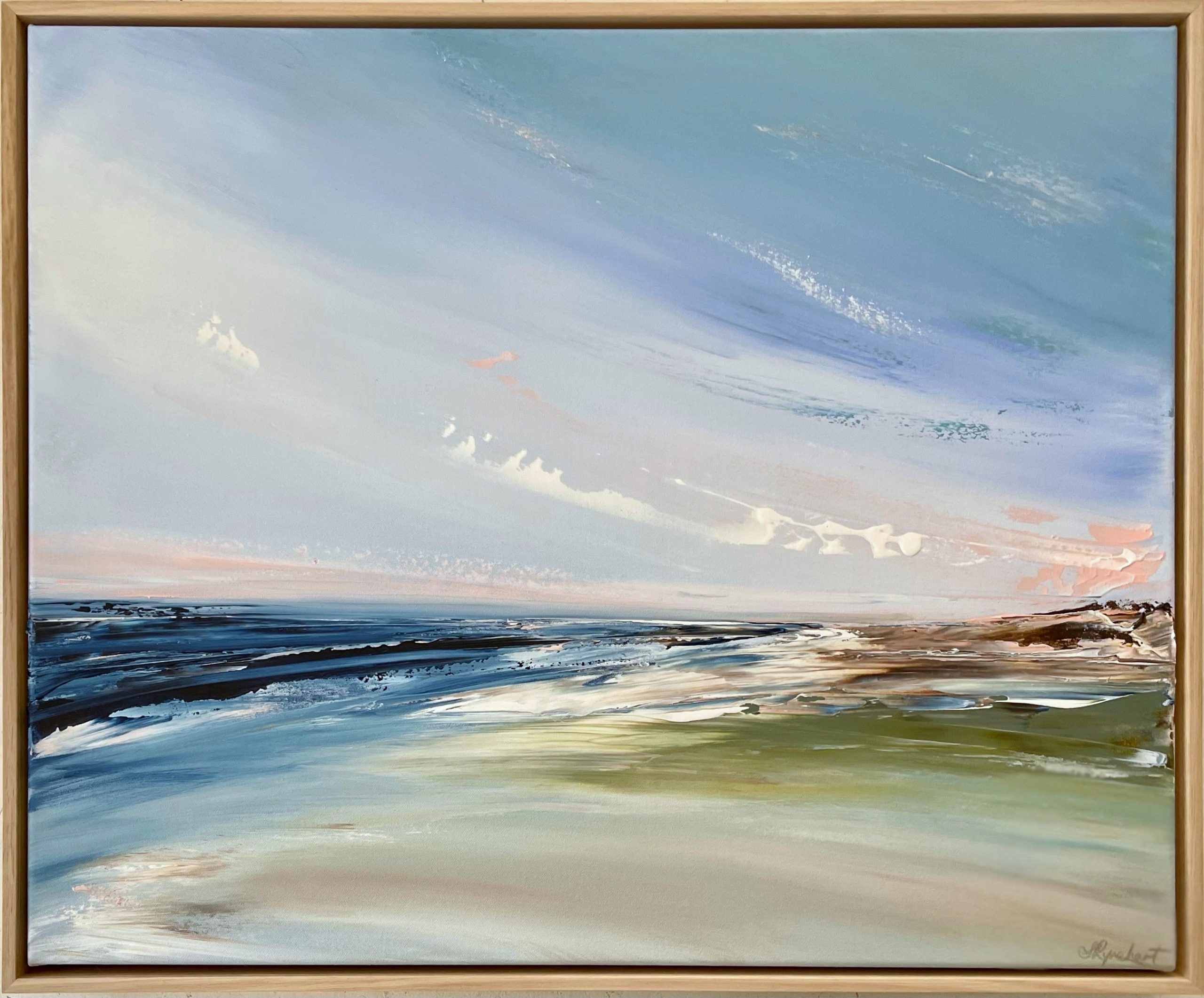 This pretty seascape is created on artist quality cotton canvas, framed in solid Tas Oak, satin varnished, and comes with a COA.