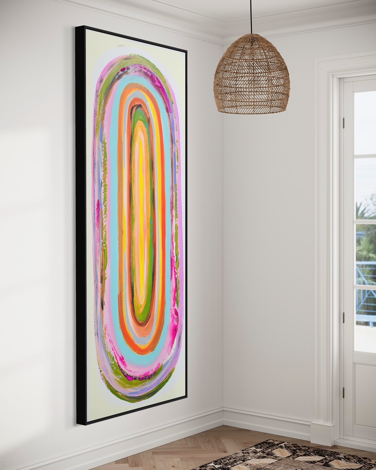 Here I have painted another colourful vibrant abstract piece. This is a large painting 2m wide or high . I love using bright colours to bring warmth and high vibes into your room . Hopefully this one goes to your home .