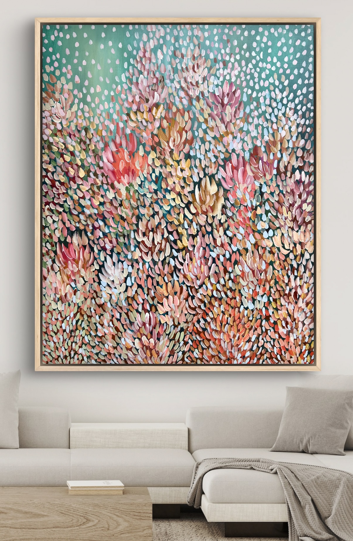 Love Fireworks a painting with warm and cool colours of the petals flying in the wind creating this beautiful explosion of petals over the landscape with lots of layers of paint . Flickering petals dancing against the blue sky, like shining stars . Petals dancing like musical notes over the landscape creating fireworks of colours . A very peaceful and tranquil painting with so much depth. The painting does not come with an external frame.The painting is signed and dated at the back and comes with a certificate of Authenticity.