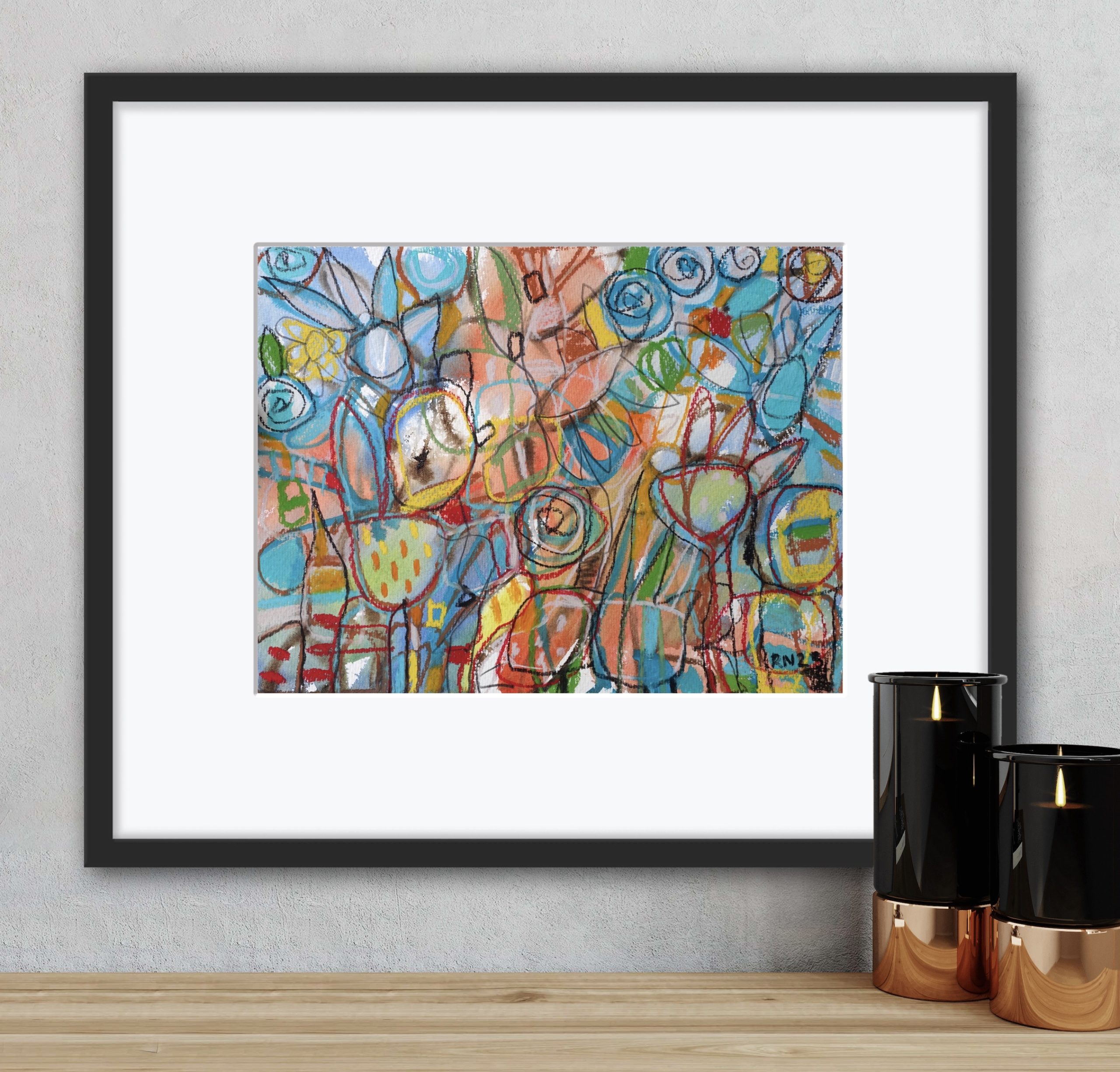 This work is Gouache paint, watercolour and Pastel on Rough, Hand Milled, Acid Free, 638 gsm 100% Cotton Paper. The art work measures 26 X 37 cm and the paper measures 29.5 X 38cm to allow for framing. Because the paper is so gloriously thick the work can hand torn around the sides as in the photo shown of another drawing (let me know if you would like this) and then can be framed on top of the mounting board.
