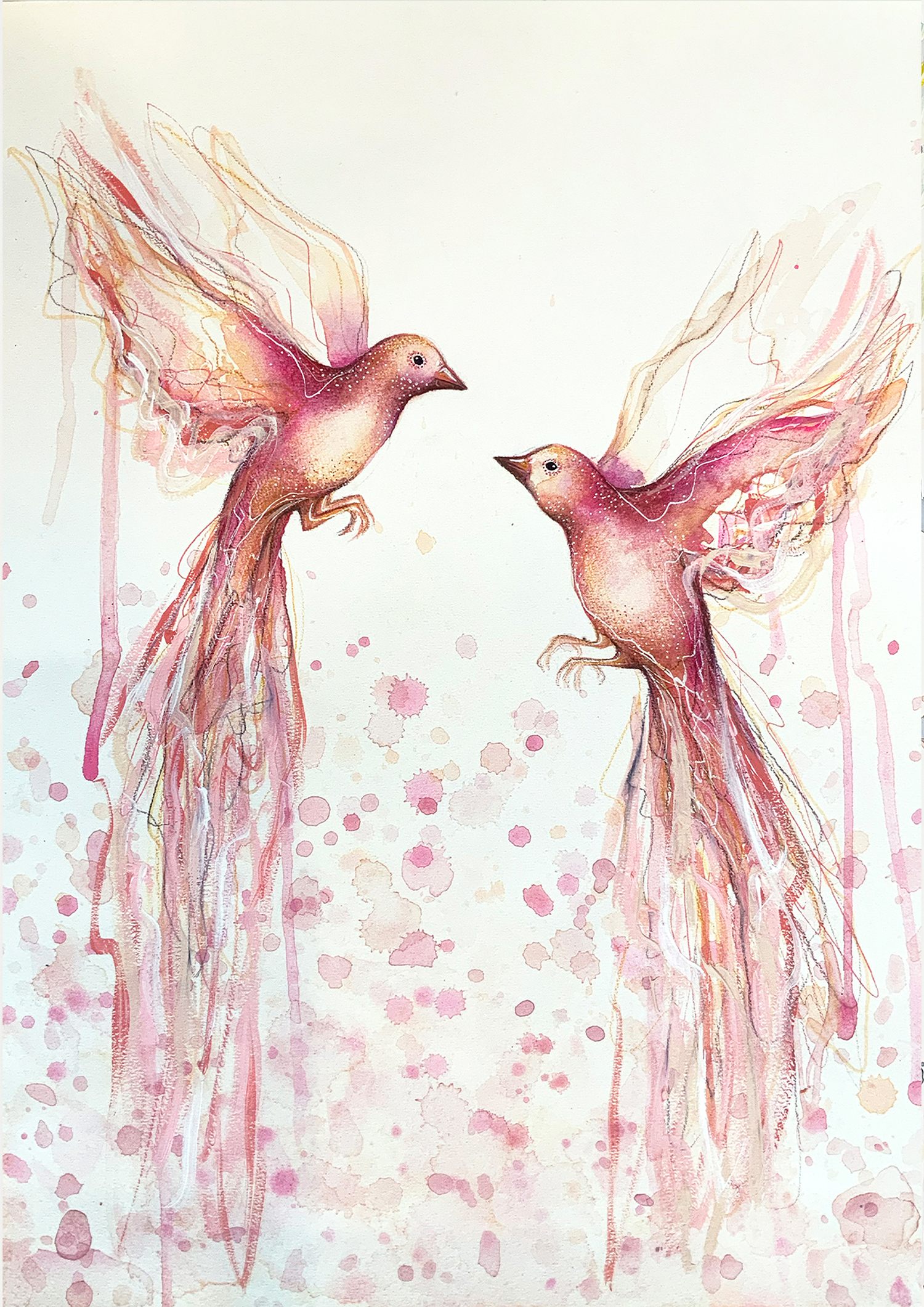 • Artist Leni Kae Detail Bird Art Watercolour Love In The Air (pink Finches)