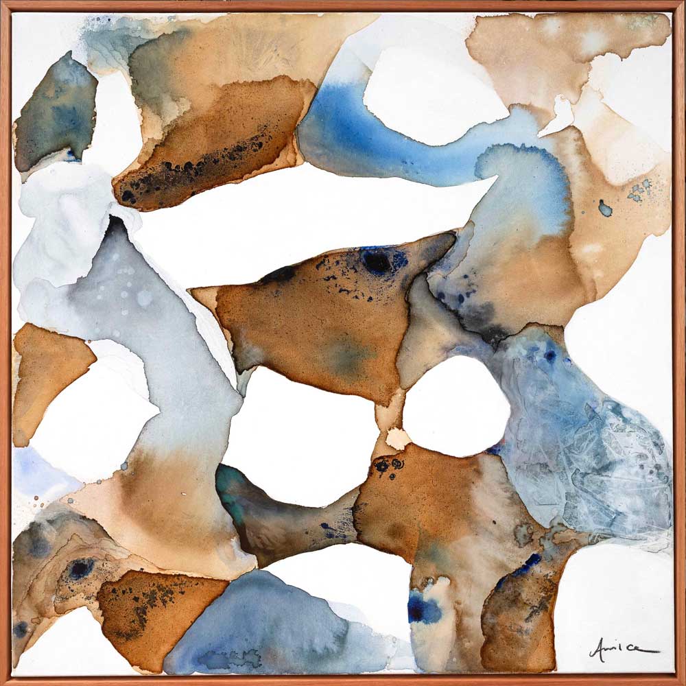 This painting is part of a collection of works called “Confluence”. I found myself irresistibly drawn to the mystical dance of indigo and earthy umber. Each piece flows with a sense of calm and liberation, capturing the essence of rivers and the sacred places where the ocean embraces the shore. These works are more than just art; they are a testament to the profound serenity and freedom that comes from connecting with the natural world. The overlapping colours evoke the simultaneous existence of stillness and movement, reminding us of the eternal connections that bind us to the earth