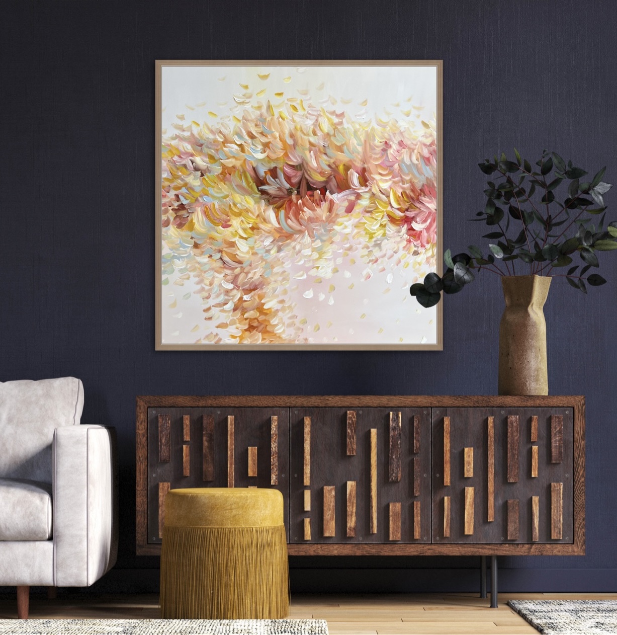 Love Me Tender by Theo Papathomas –  a painting with beautiful warm colours of the petals flying in the wind creating fireworks in the sky. Like beautiful jewels shining like stars in the sky. Capturing the light of the sun falling on to the petals creating a beautiful bouquet of Petals . Petals weeping onto the landscape creating this beautiful veil of colours covering the whole sky . A composition of colours and rhythms of petals dancing in the sky like musical notes . A very peaceful and tranquil painting with so much depth . The painting does not come with an external frame.The painting is signed and dated 2022 at the back and comes with a certificate of Authenticity.
