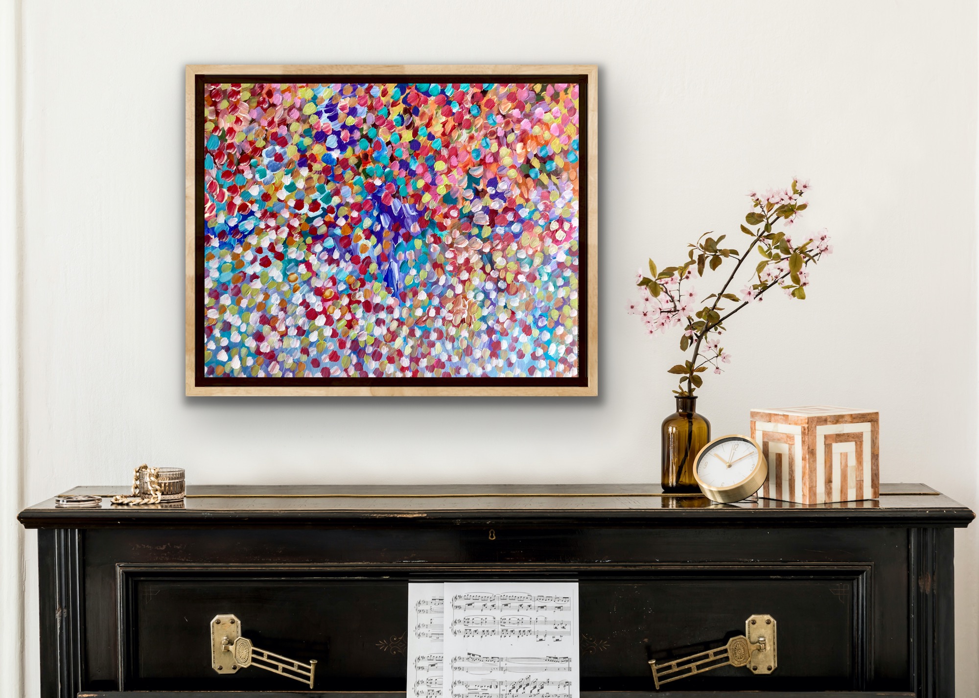 Love Petals by Theo Papathomas is a beautiful and tranquil painting. When you get up in the morning and see the beautiful colours of the petals weeping onto the landscape. Petals come together to create this beautiful harmonious composition of colours and rhythms. Petals dancing next to each other to create a beautiful veil of colours covering the whole landscape .A very harmonious and tranquil composition that can be enjoyed many years to come. The painting is framed.The painting is signed and dated 2020 at the back and comes with a certificate of Authenticity.