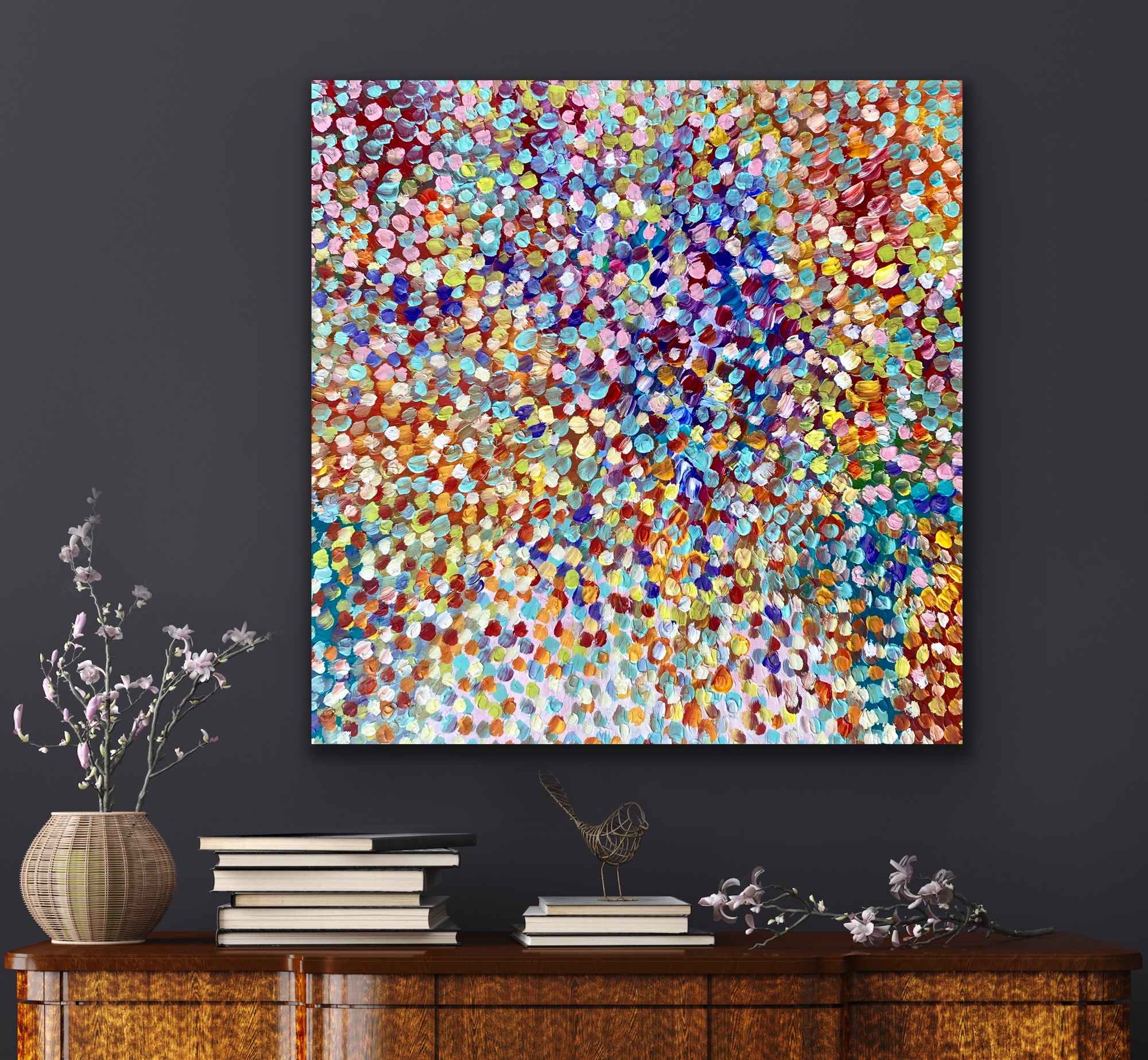 Love Potion  by Theo Papathomas a painting of Wildflowers of petals weeping onto the landscape creating this beautiful veil of colours covering the whole landscape with beautiful warm and cool colours. A composition of colours and rhythms of petals dancing in the sky like musical notes makes it very hypnotic and mesmerising. A very peaceful and tranquil painting with so much depth. This painting is painted on canvas, signed and dated 2021 at the back and comes with a certificate of Authenticity.