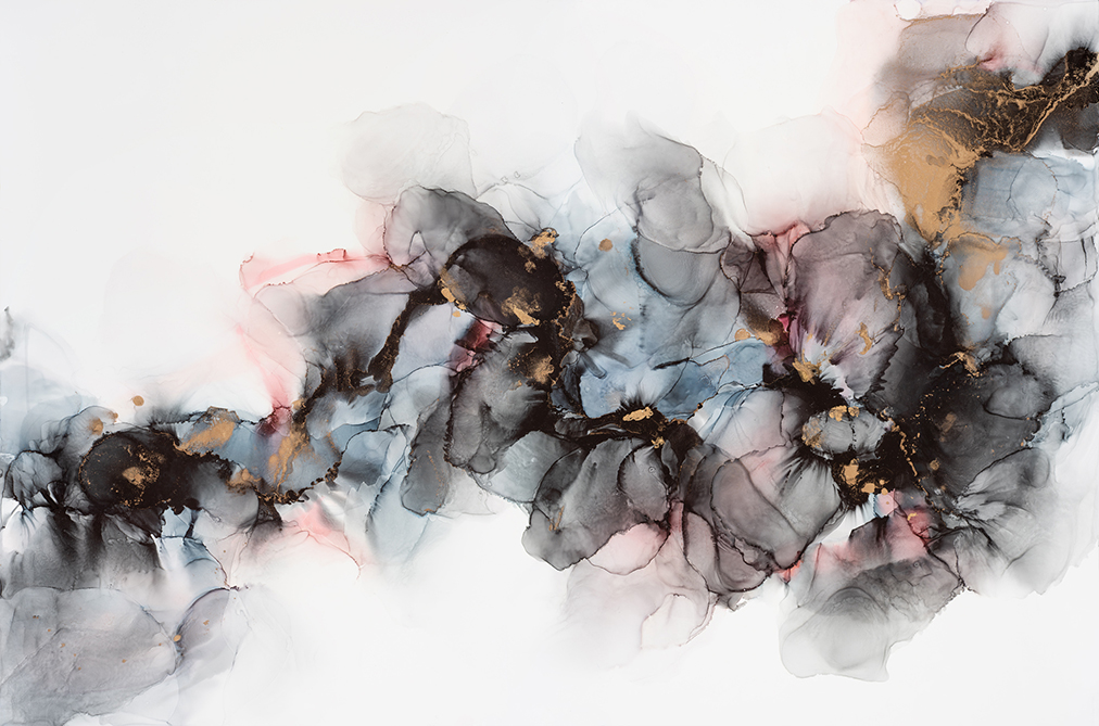 An unframed original artwork created with pink, black, grey and brassy metallic gold.