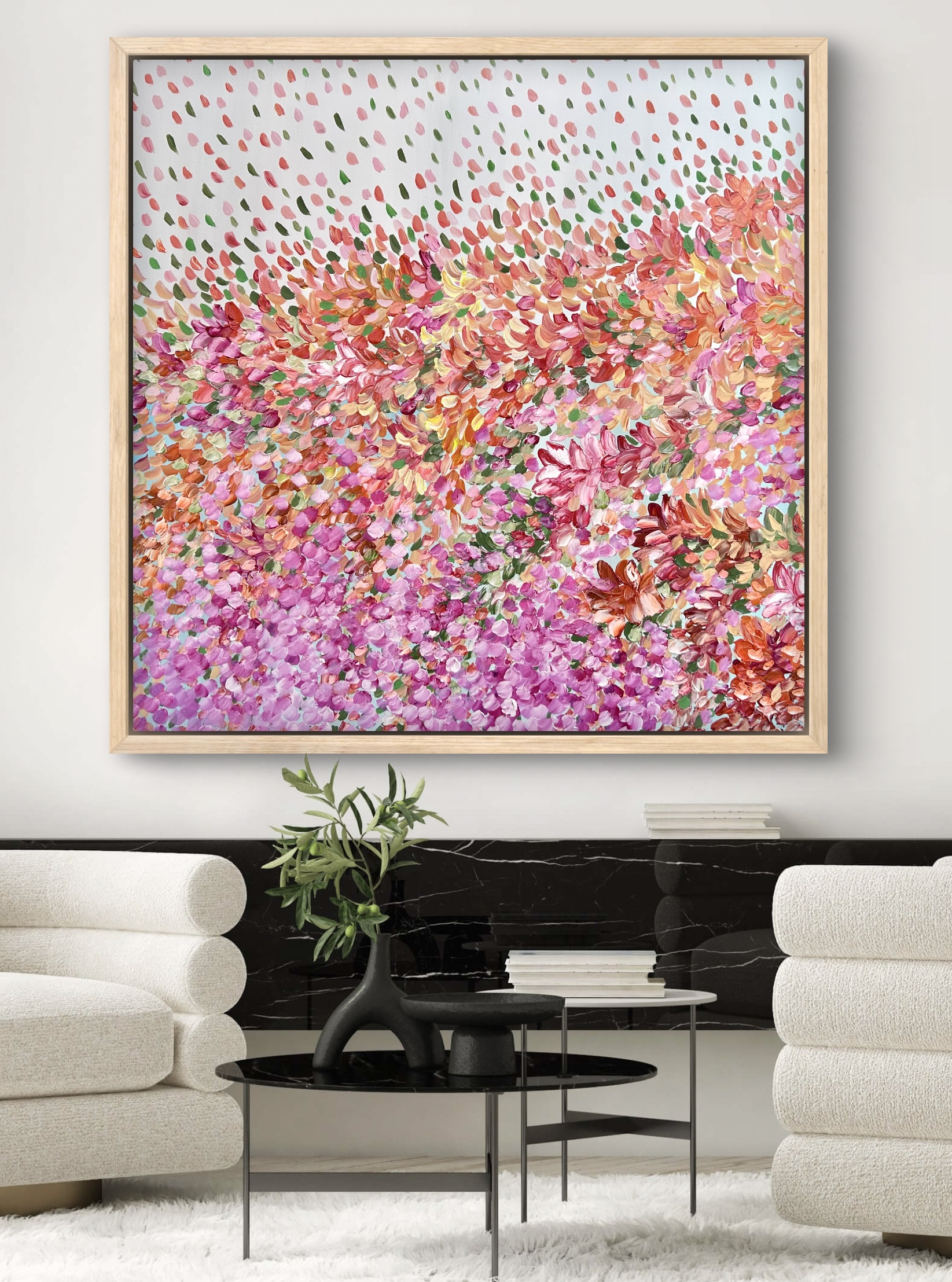 Love you for Life a painting with warm and cool colours of the flowers and petals flying in the wind creating this beautiful bouquet of petals over the garden with lots of layers of paint. Petals weeping over the garden creating this veil of petals with so much movement and rhythms. Petals dancing like musical notes over the garden creating a carpet of colours painted with a pallet knife and brush to create so much texture . A very peaceful and tranquil painting with so much depth. The painting does not come with an external frame .The painting is signed and dated at the back and comes with a certificate of Authenticity.