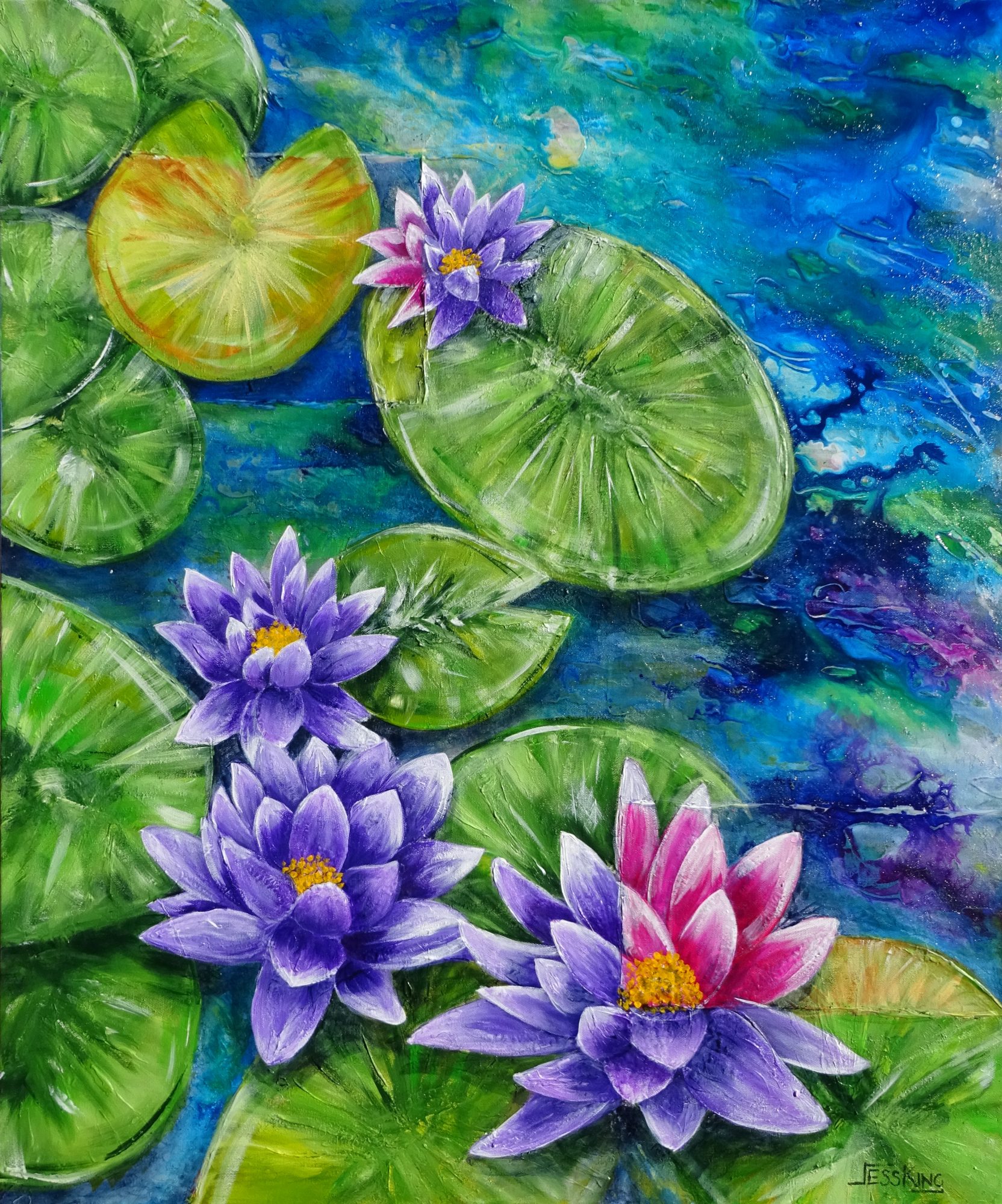 Water Lilies are a perennial plant with heart shaped floating leaves with exotic blooms that may float or stick above the water, opening in the morning and closing in the afternoon. The main focus of the painting depicts purple lilies and in 2 small windows as they are seen when pink and pretty. Water lilies are calming as the water they grow in can only be a steady stream thats how life should be, a steady stream.