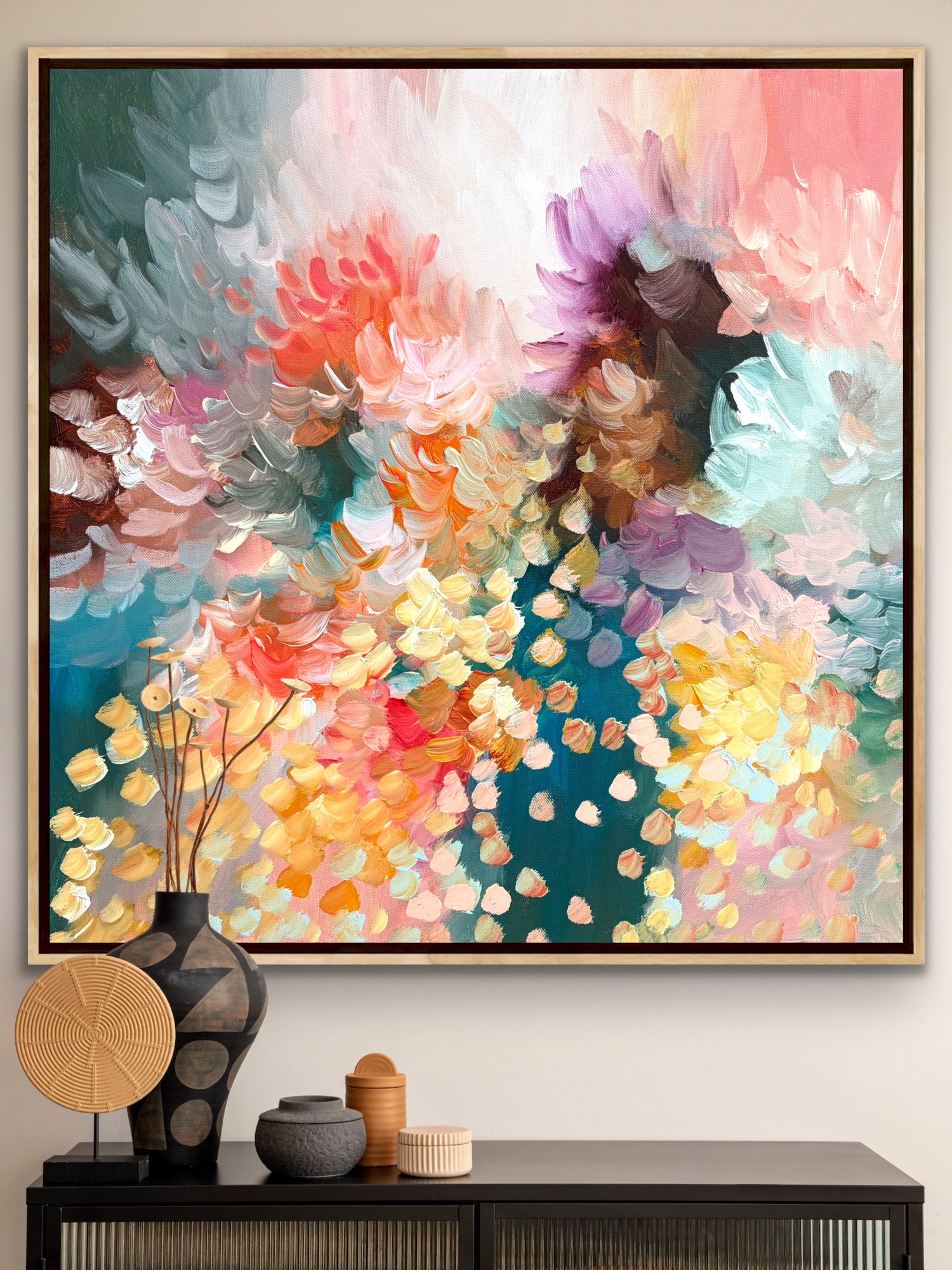 In this piece, I poured my emotions into every brushstroke, blending soft pastels with vibrant pops of color to create a dance of light and movement. The abstract impressionism invites viewers to feel warmth, joy, and renewal, as if witnessing a blossoming garden in full bloom. This painting fills any space with an uplifting, energetic essence that sparks inspiration and calm simultaneously..l