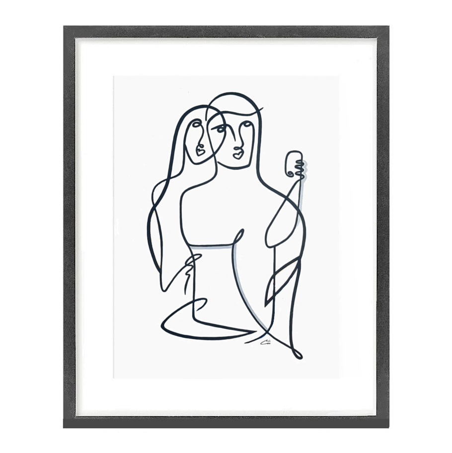 Lovers celebrating their happiness together through sharing photos on social media and with friends. Flowing lines intersect throughout the piece, especially on the two faces creating the perception of oneness and love.