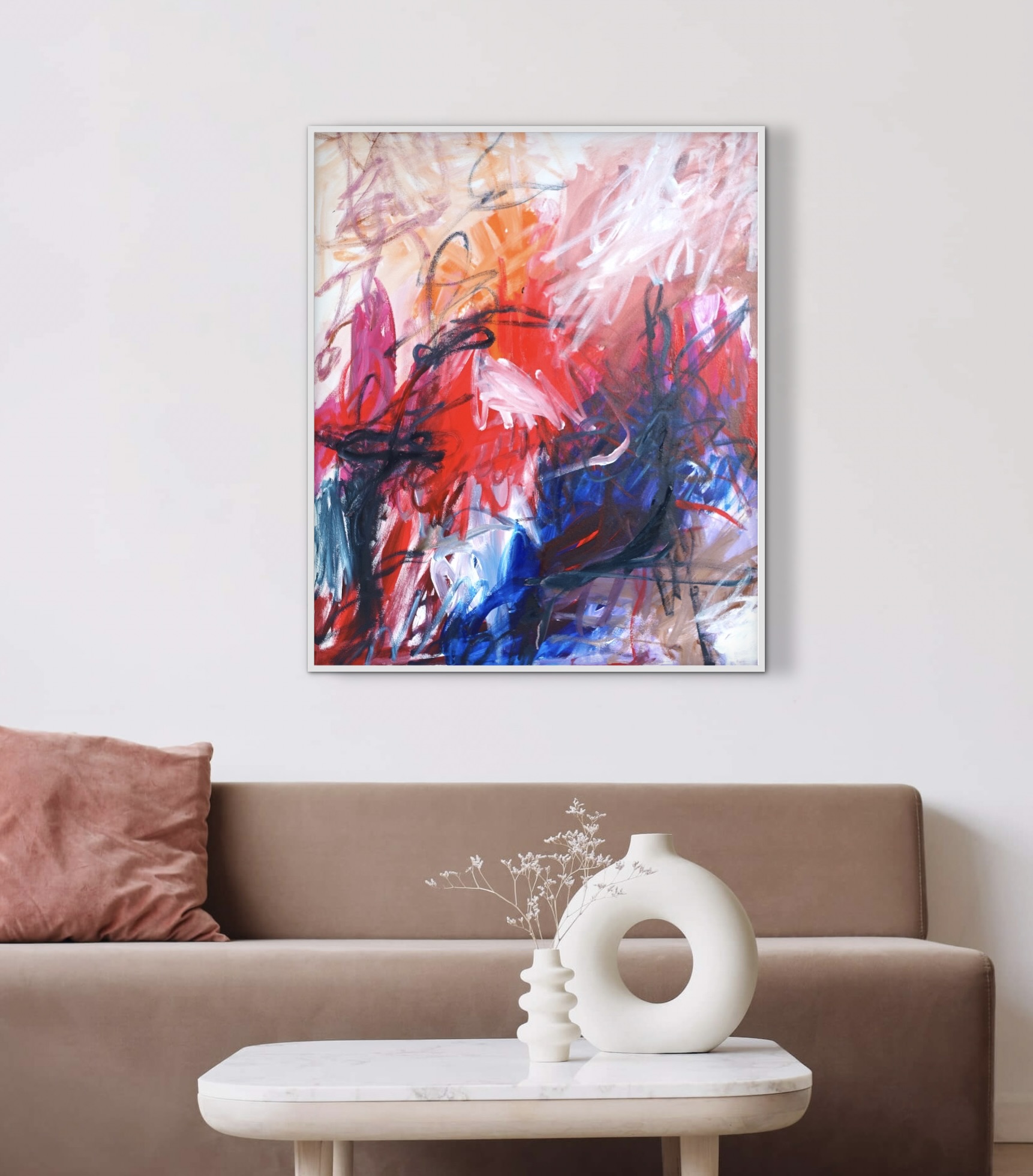 This work is sent without an exterior frame (images are to give an idea of what it would look like with an exterior frame). The work is painted on the sides so that if you decide to hang it as it is without an exterior frame it will still look lovely from any angle. No ugly white sides. If adding a frame I suggest matching your home rather than the painting ie if you have a lot of timber use a timber frame etc.