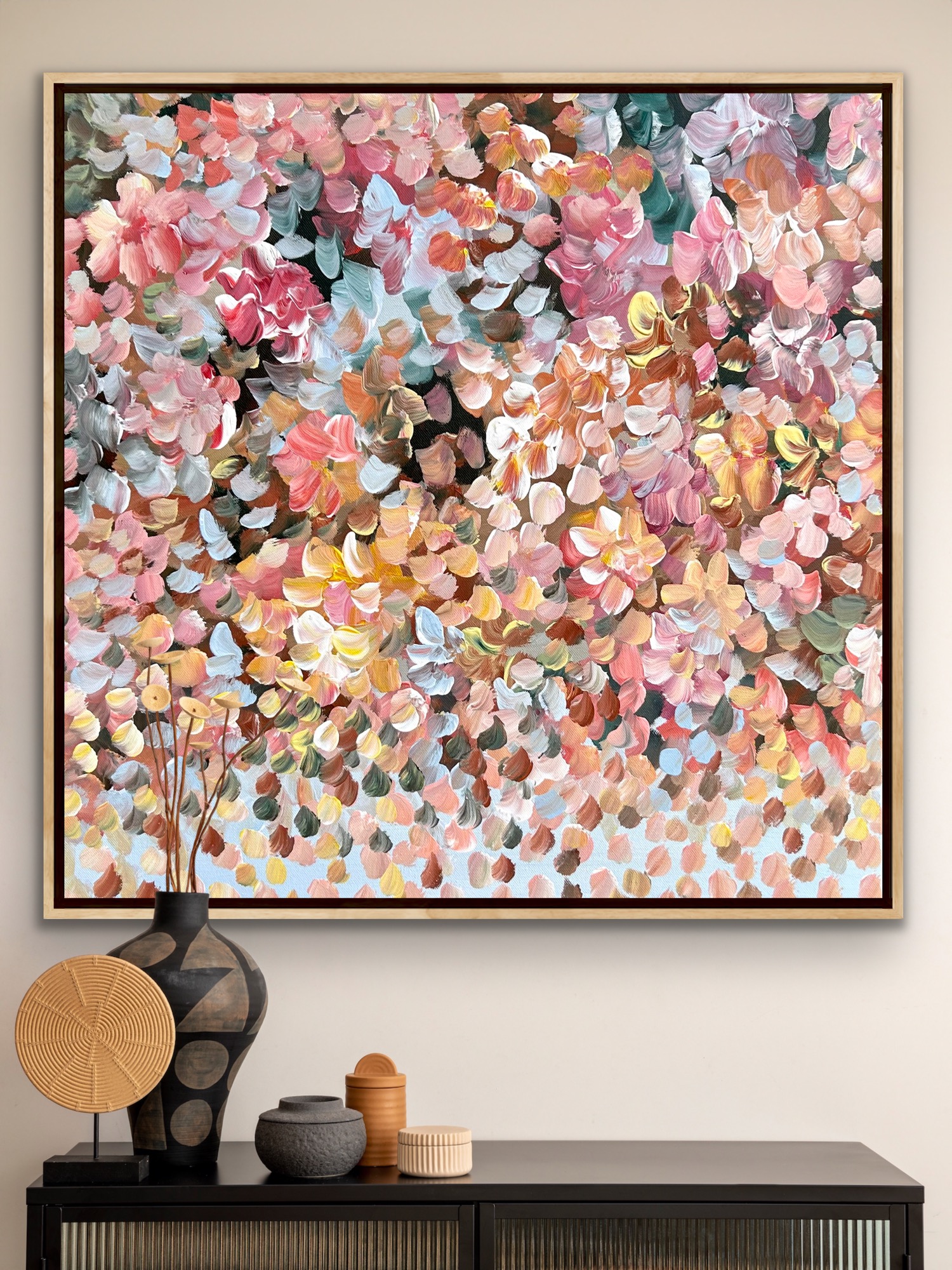 Is a painting with warm and cool colours of flowers and petals flying in the wind, creating a bouquet of petals over the landscape with lots of layers of acrylic paint. Petals weeping over the landscape creating so much movement and rhythms . A very peaceful and tranquil painting with so much depth.