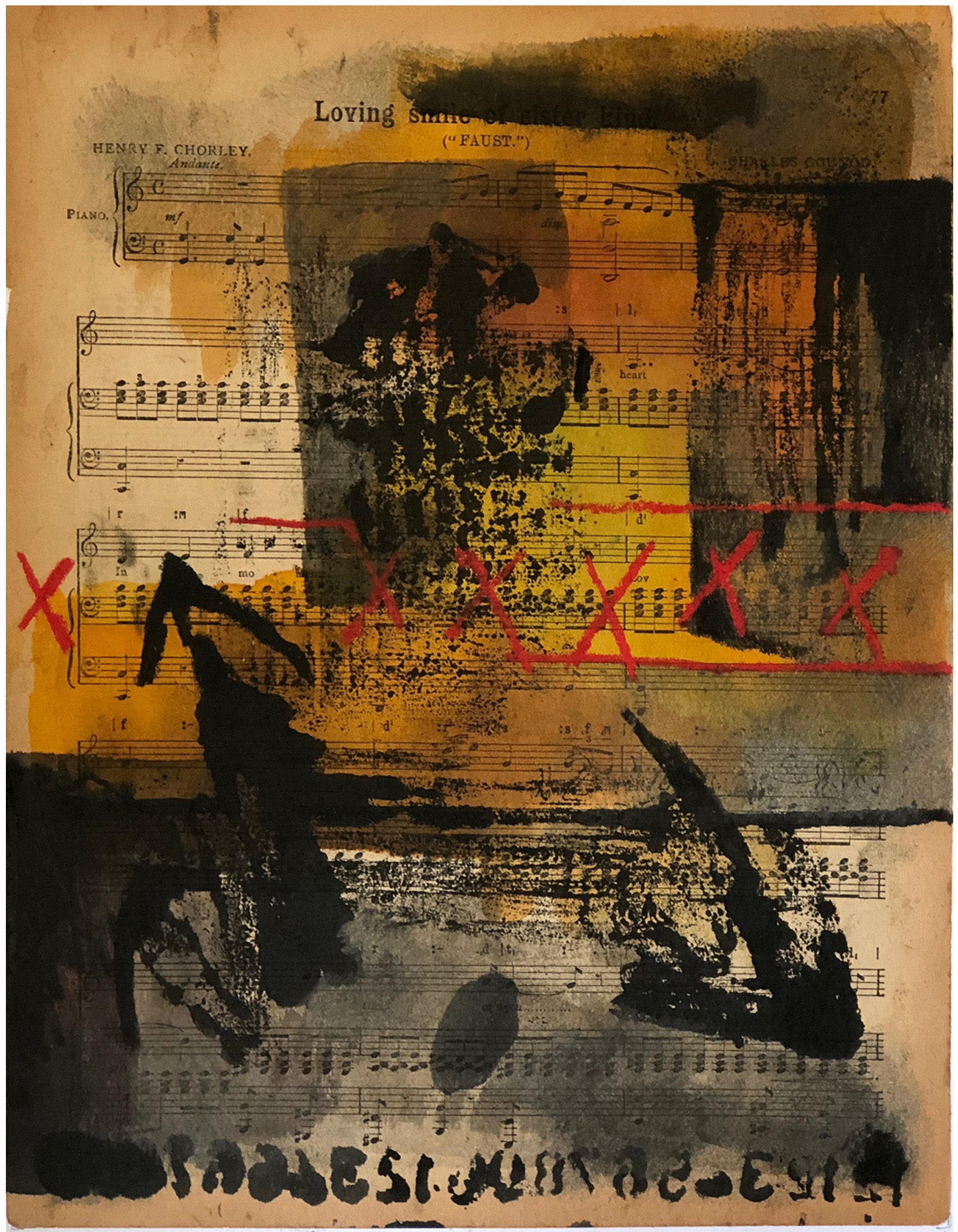 “Loving” by G Custom Kuhl is an original mixed media artwork on vintage music paper that has been adhered to cardboard. It includes the use of pencils, inks, paints, stencils and hand made forms that have been hand printed. This is part of a smaller series of work that has been based on the vintage music paper.
