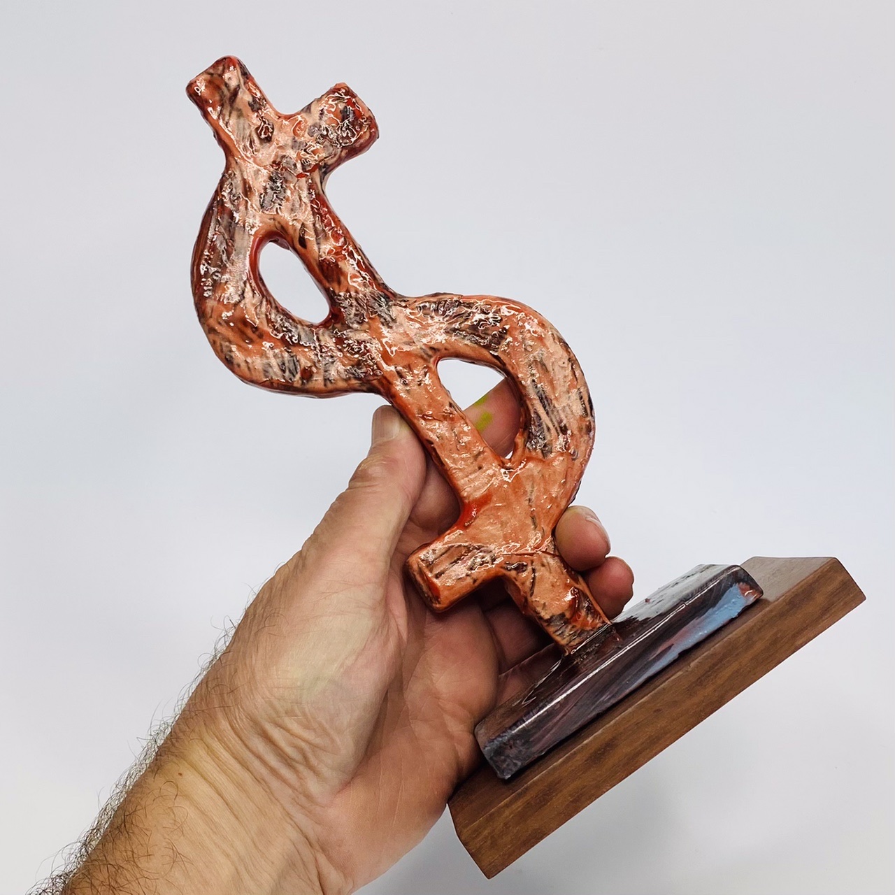 A dynamic rendition of the dollar symbol. Fired many times with various glazes and slips. Mounted on polished rosewood block. This work is part of an ongoing series of auspicious symbols. A striking piece.