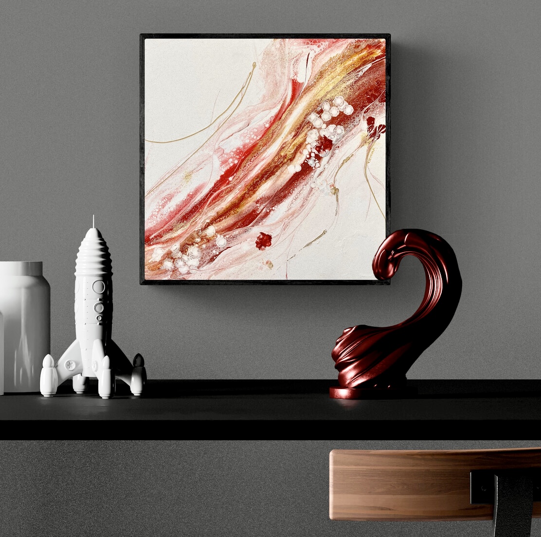 Represented by splashes of red and gold threads intertwined mimicking the many feelings associated with finding your true love.