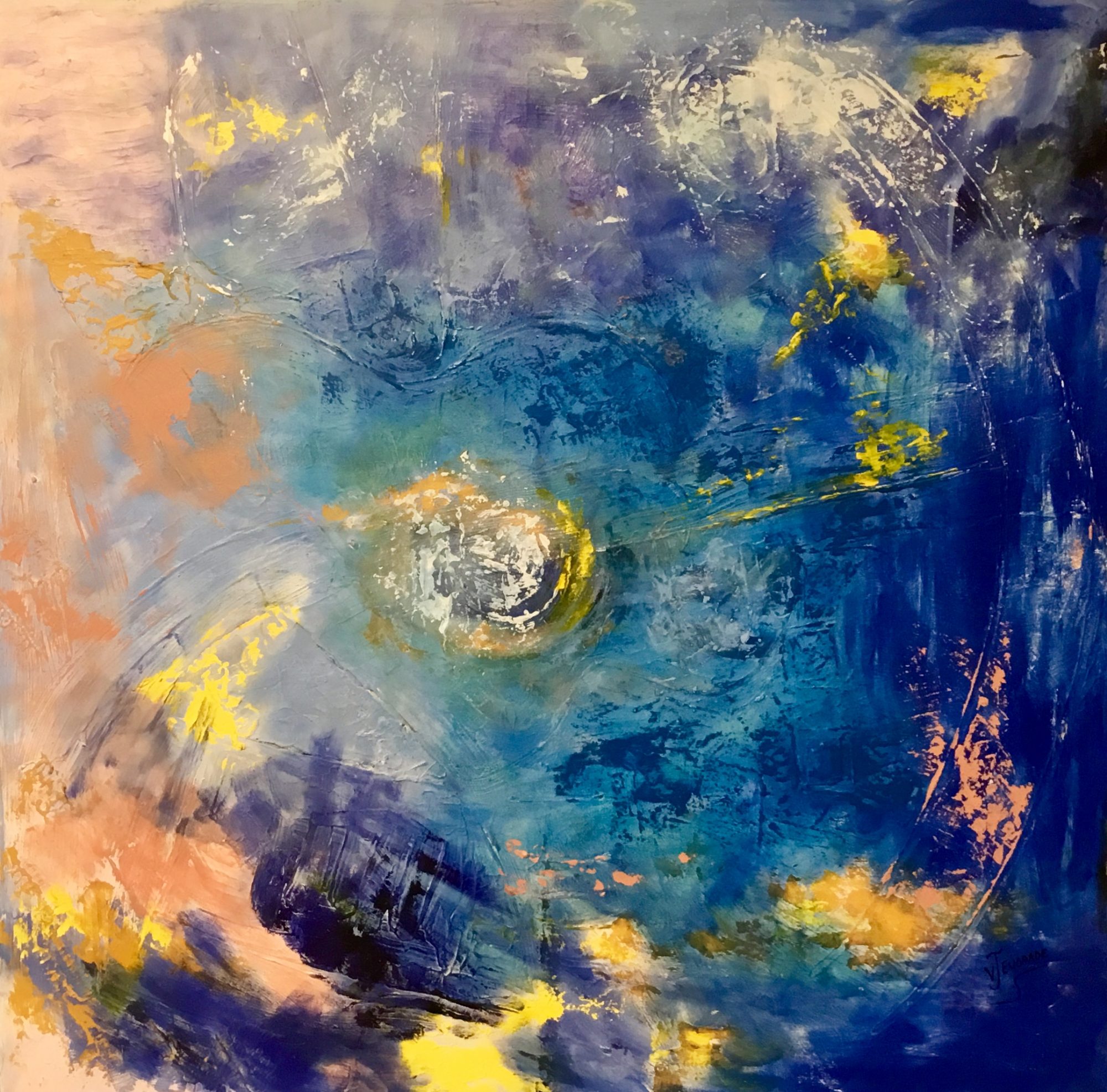 Lucy in the Sky is an abstract painting based on my emotion, I had so many ideas in my head that I was spinning around so I chose colours I liked and intuitively threw them at the canvas, blending in areas and shapes not knowing what on earth I am doing but loving the process, sometimes what is in your heart transpires to the painting, not sure what the message is in this one except believe in yourself and push the boundaries.