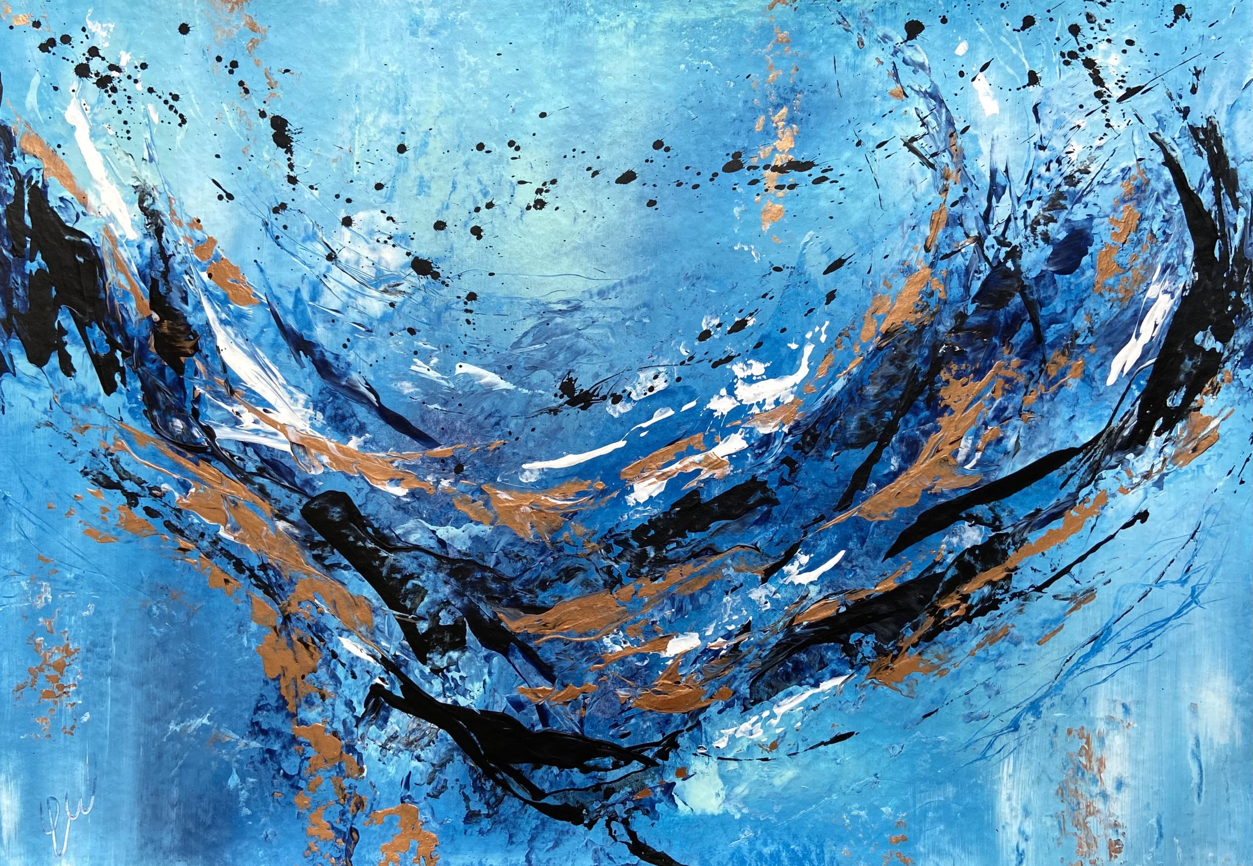 A very lively abstract filled with energy and captured movement. This piece has beautiful shimmering metallic accents. Some images show what this piece looks like framed. Frames not included. 59.4 x 42 cm (A2 size) Acrylic on paper. Requires framing.