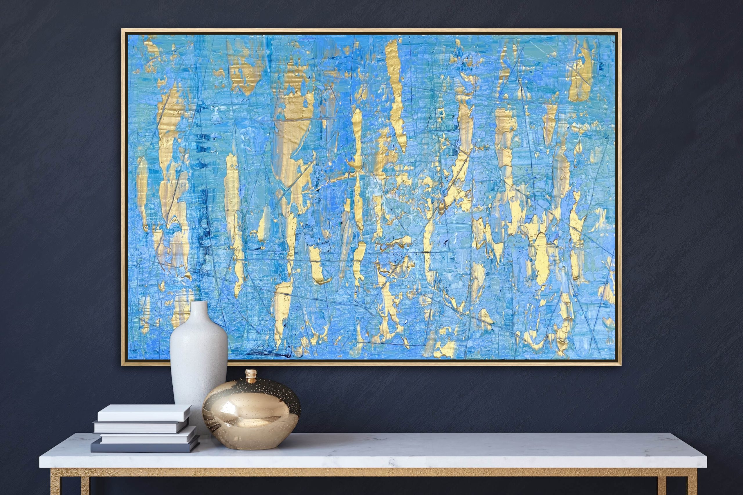 This style of painting has been creating by adding and removing layers of paint with a palette knife. The painting changes depending on where the light is coming from and how much light is picking up the pale gold. The surface of the painting is heavily textured using different methods from scratching the paint to adding thick layers of paint.