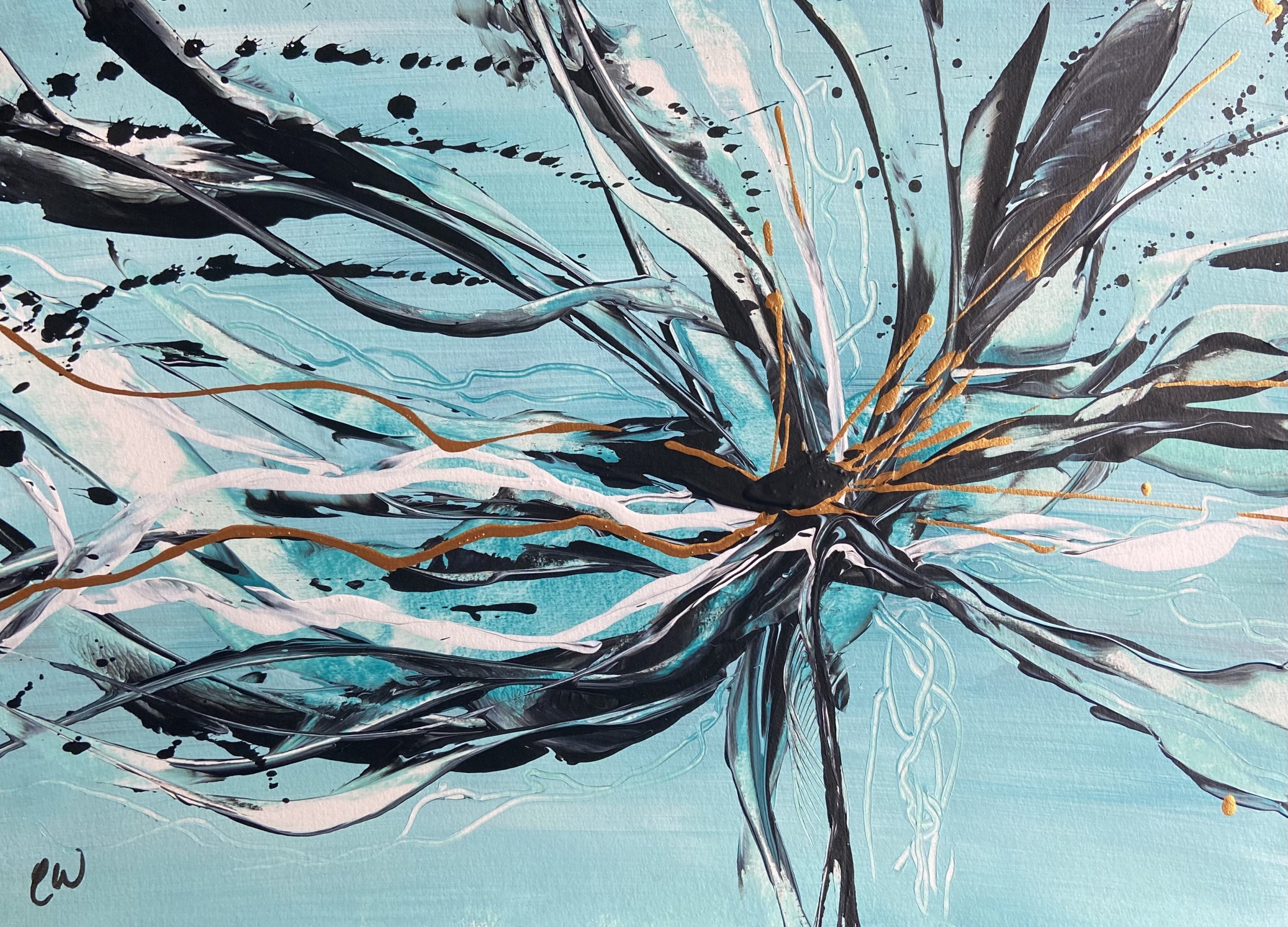 Luminous by Carrie Welsh is a beautiful and peaceful abstract that has a gorgeous colour palette of aqua, black, white and gold. 29.7 x 42 cm (A3 size) Acrylic on paper. Requires framing. (One image shows what this piece looks like framed. Frame not included)