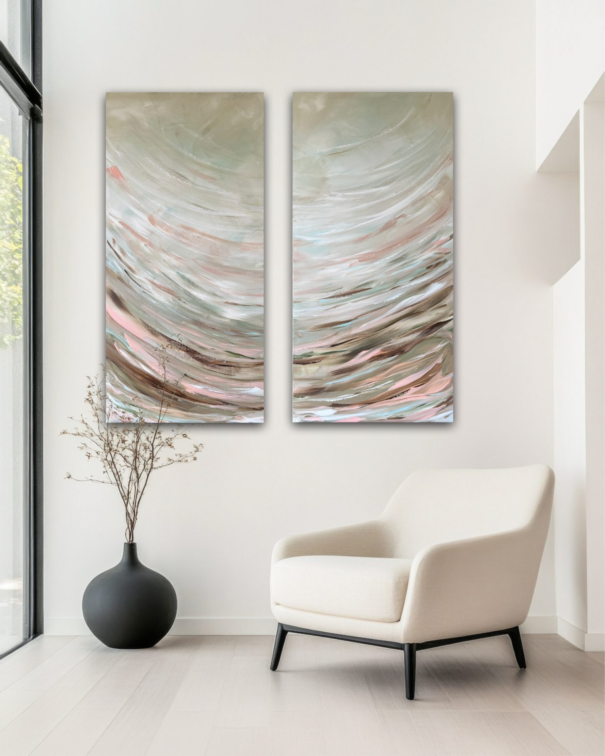 This artwork features soft, flowing brushstrokes in earthy tones of beige, taupe and brown, gently interwoven with touches of blush pink, sage green and white. The movement within strokes, creates a wave-like movement evoking a sense of calm and harmony.