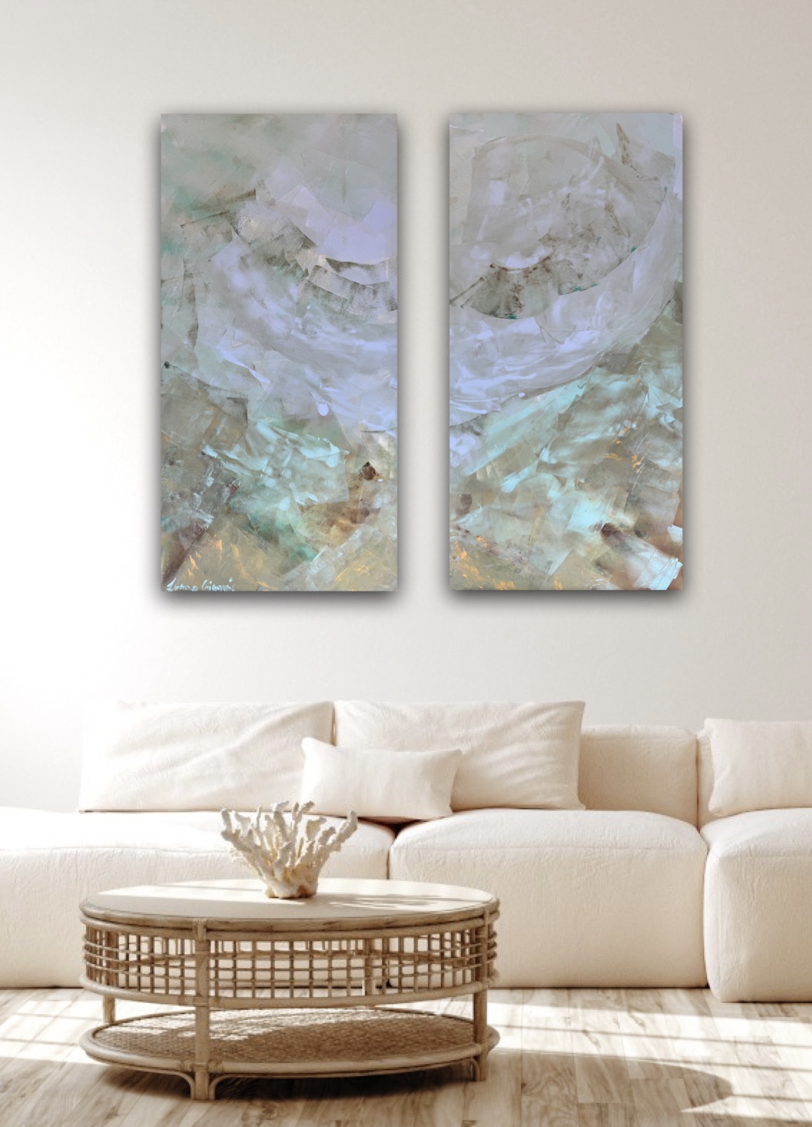 ‘Lunar Waters’ evokes a sense of movement and reflection with soft blues, misty lilac and delicate shades of teal. The brushstrokes suggest a dance between water and light, creating a serene yet powerful energy. A perfect addition to a calm and modern space.