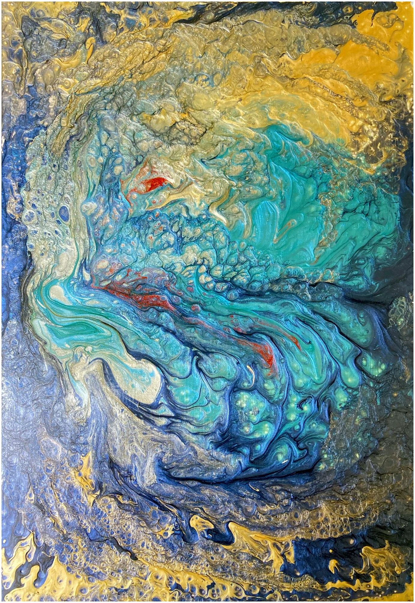 This work is one of the very few pieces I have created with Pebeo ‘Moon Fantasy’ paint as this medium is very difficult to find in Australia. Using Pebeo Moon Fantasy in a fluid form has allowed me to recreate some stunning patterns and colour variations and resulted in unpredictable arrangements. The difficulties to acquire Pebeo Moon Fantasy Paint, led me on a quest to create these results with Acrylic Paints and subsequently I discovered Fluid Acrylic Painting.