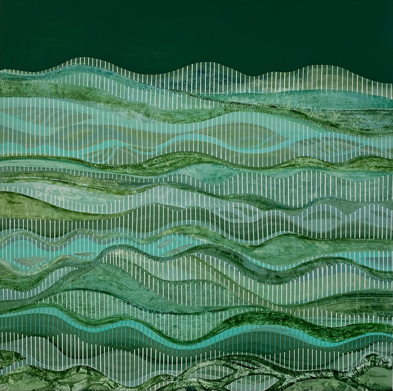 This artwork is an original abstract using and acrylic paint and artist marker on cotton canvas. This atmospheric abstract landscape that features a fusion of two contrasting elements of a free flowing energy combined with striking bold stripes. I have used many layers of contrasting textures and patterns that are weaved throughout like a tapestry. The colour green is known for representing tranquility, vitality and the natural environment, so if your are searching for an uplifting and sublime artwork for your space, ‘ Lush Greenery’ is one that will inspire.