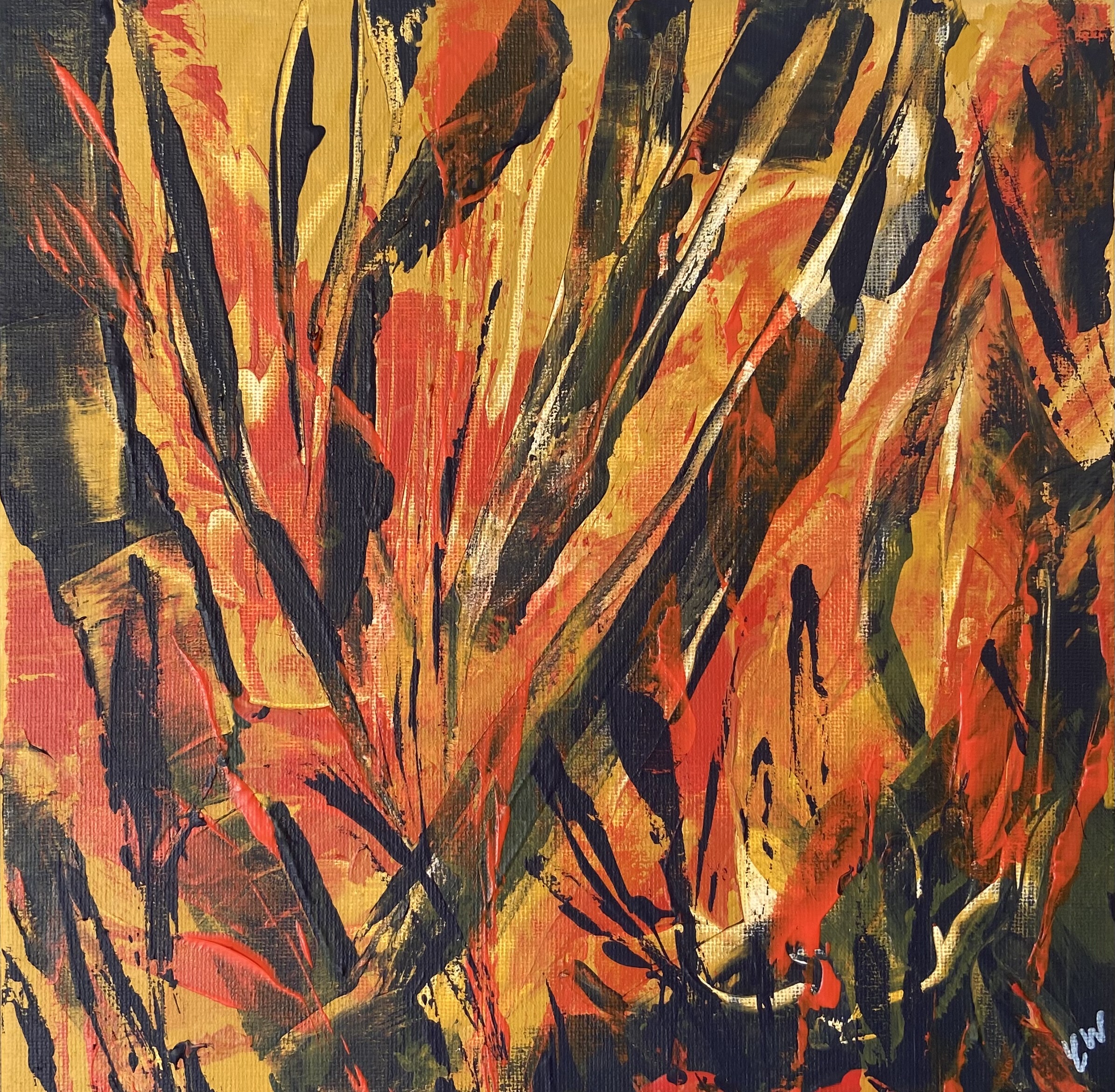 Lush Hinterland by Carrie Welsh is an abstract botanical piece with beautiful details. 25 x 25 cm. Acrylic on canvas, ready to hang. Frame not included.