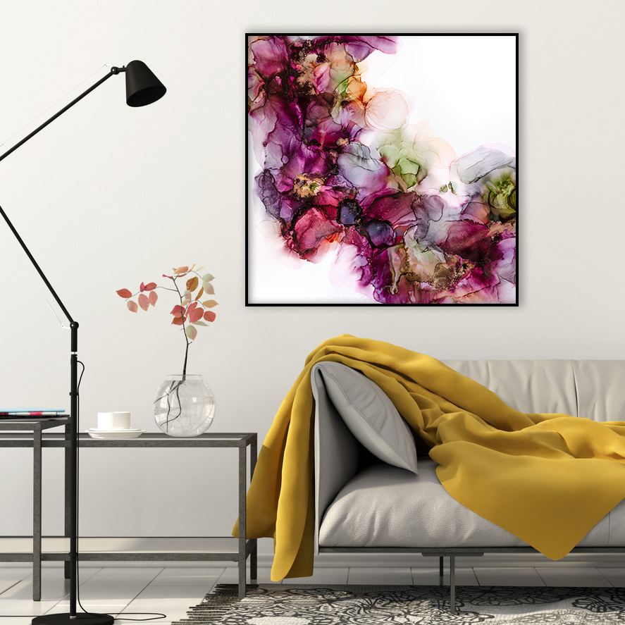 A vibrant square print with the colours of purple, pink, green, orange and gold. This artwork oozes happiness and will be sure to brighten up your day every time you walk by it.