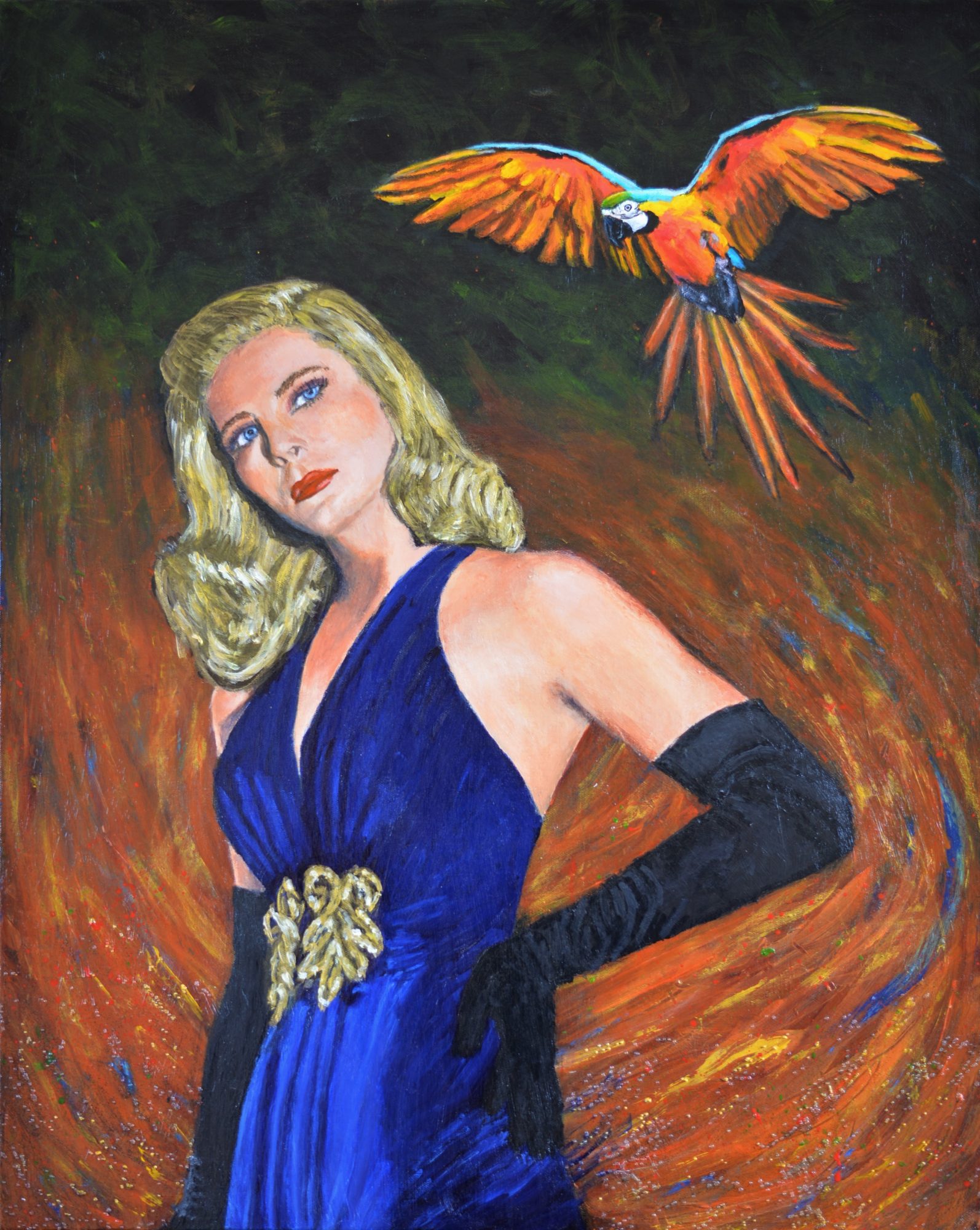 Original surreal 1940s retro Hollywood bird painting on high quality stretched canvas with Lizabeth Scott and macaw ready-to-hang with d-rings and picture wire. The inspiration for my paintings is the glamour and drama of Hollywood movies of the 1940s and 50s. These movies often used expressionist lighting and camera shots. I appropriate and transform the black and white publicity stills from the films by painting them in arbitrary colours, and often placing them in incongruous and sometimes bizarre settings, and/or with exotic animals such as snakes, macaws, leopards, tigers, and spiders. My paintings are created using acrylic paints, gels and mediums and often have interesting textures and a glossy or metallic surfaces. Jungle Siren is a painting of Lizabeth Scott, a Hollywood film noir star of the 1940s. She is placed in a swirling forest with a large exotic macaw. She seems out of place which creates a puzzle for the viewer to solve. Ready-to-hang with d-rings and picture wire.