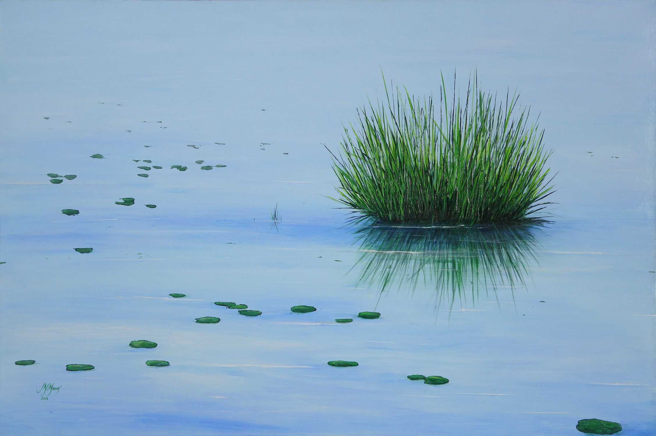 Serene, the quiet waters of the wetlands are in contrast to the busy Steve Irwin Way that runs alongside. Dark green reeds, unaffected by the bustle of the road, enjoy peace in the still waters. Unframed but ready to hang 36″x24″ painted edges.