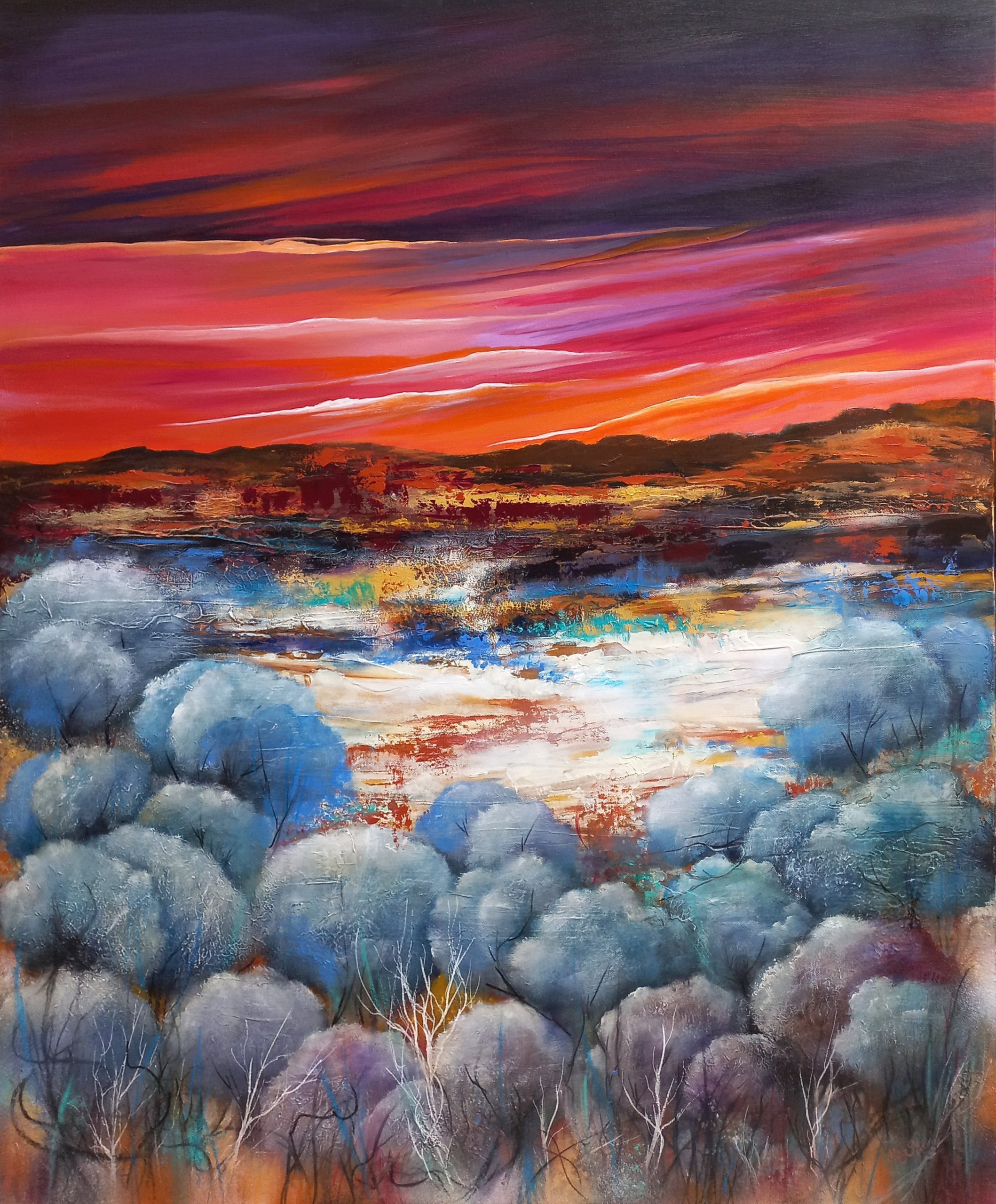 In ‘Magenta Sunset’ the light spreads across the trees in muted shades of blue and violet. There are shades of magenta, burgundy, lavender, deep purple, orange, yellow and white in the sky. The central area has been created using palette knives for texture to give the impression of a rocky landscape. There, I‘ve used shades of brown, cream, blue and white.