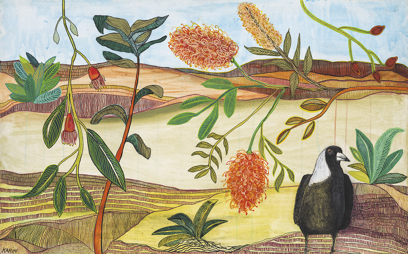 Maggie in the Hills is a fun colour interpretation on the landscape, set in a hills environment / valley where there is still open areas of land amongst  the hills. Plants that are prominent in the painting are Grevilleas and gum trees. Where I live in the Hills of Perth my property is surrounded by them so this inspires me. I also love the Magpies that often come to visit as this just adds to the joy of living in the bush.