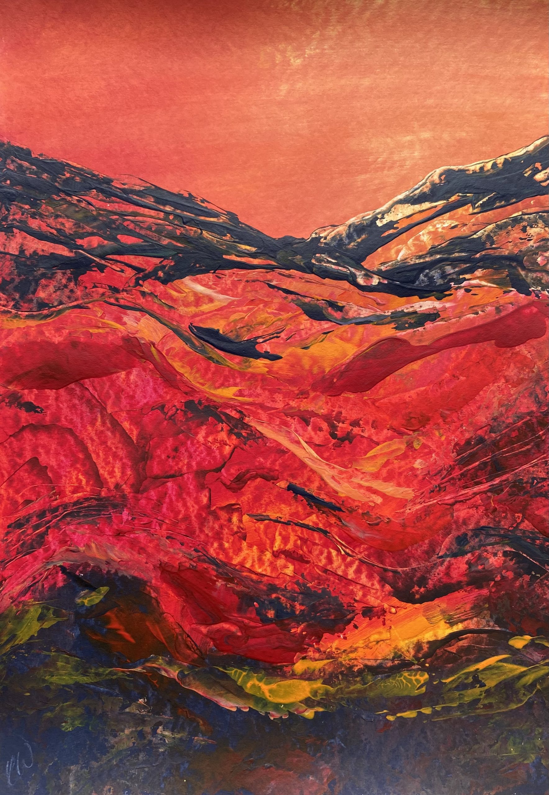 A beautiful abstract landscape piece that radiates sunset warmth. Some images show what this piece looks like framed. Frames not included. 59.4 x 42 cm (A2 size) Acrylic on paper. Requires framing.