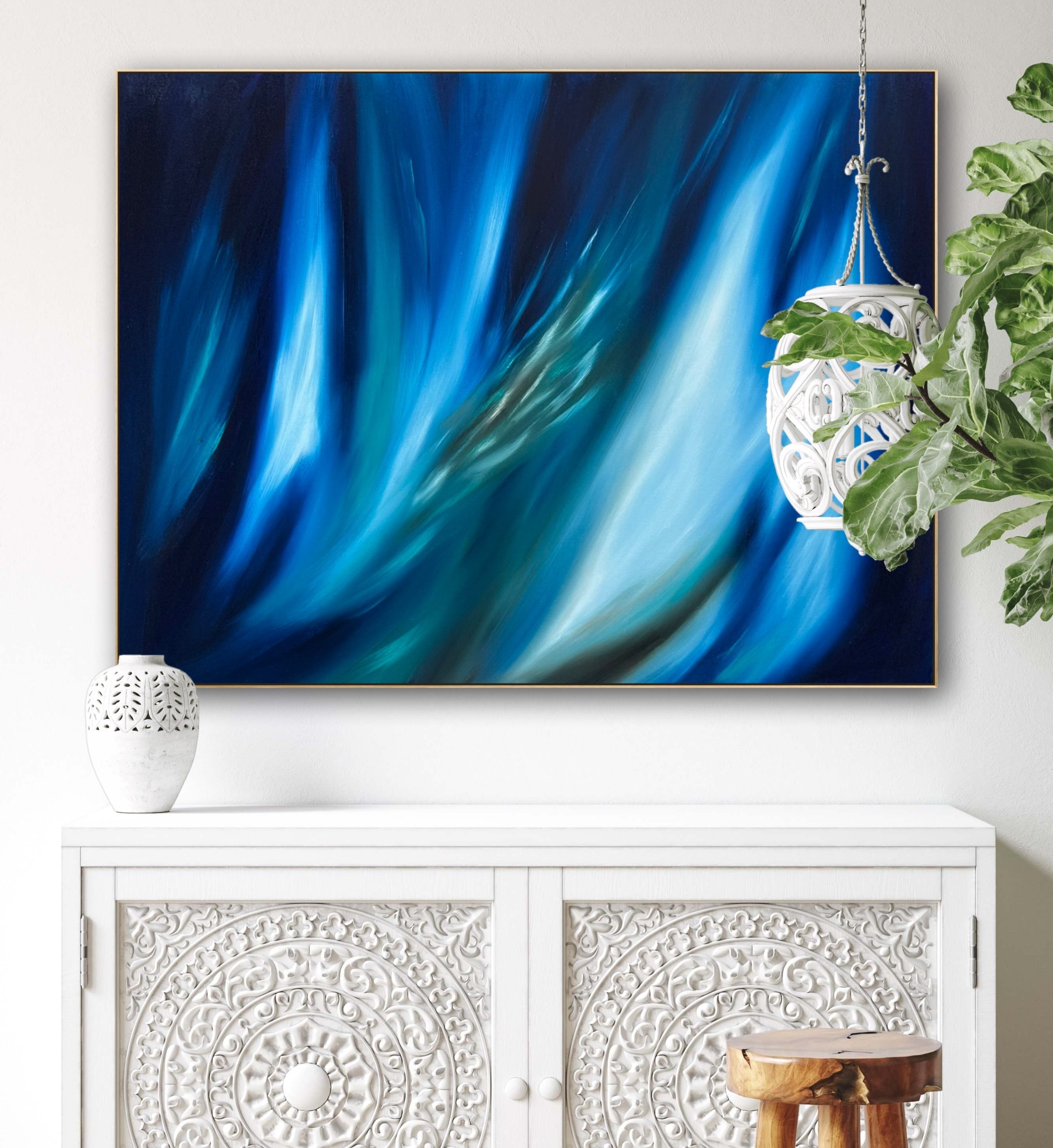 This oil painting has a sense of movement and bright light through the mysterious blues.