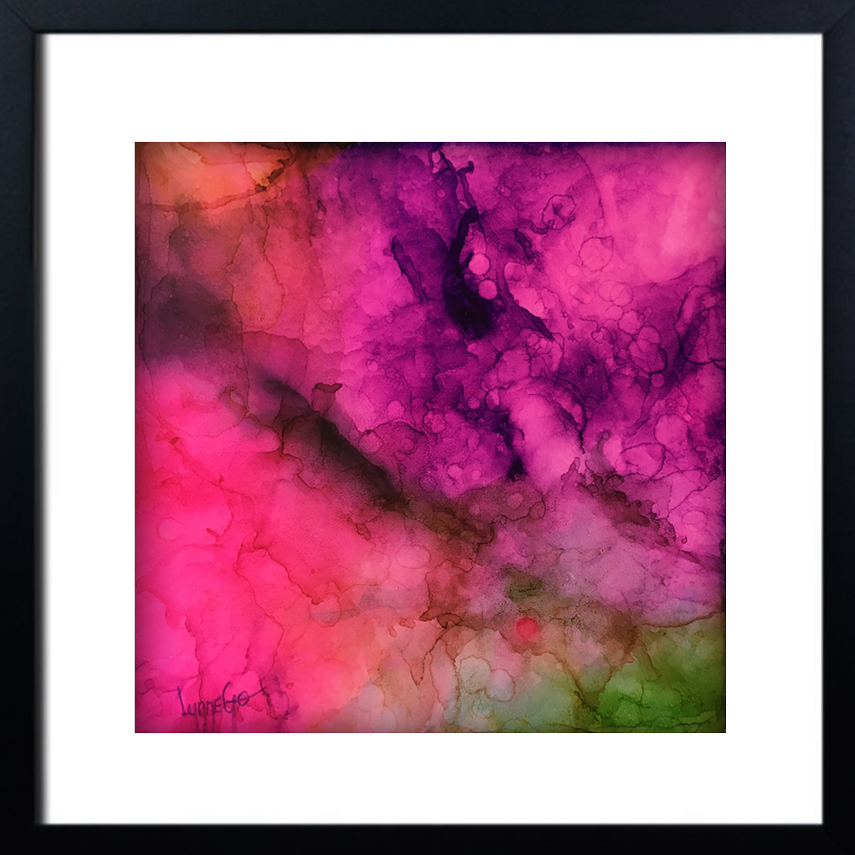 This stunning piece is created with alcohol inks of vibrant pinks and purples with splashes of green and orange.