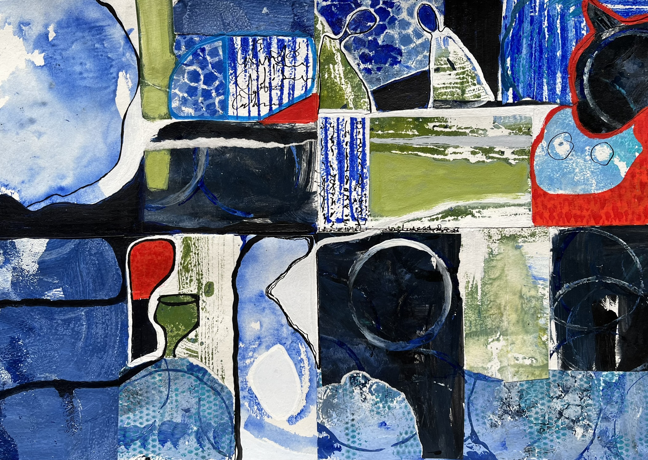 I have been back in Bali again for 2 months and have been doing some works on paper. This is one of two collages made from a series of collage papers I prepared with only blue colors (French ultra marine, cerulean blue and cobalt turquoise light) and a little white and black acrylic paint. They came out pretty good and a great exercise for the brain to do something different now and then and to get my mind of other things happening in the world at the moment and here around us in the little compound where we stay in a lovely Pondok. Going for long walks through the rice fields with its water ways especially when it’s been raining is such a magic thing day and night! A big inspiration. Here’s the first collage I made and I added a punch of lovely pyrrole reds which I think gives it a magic lift!