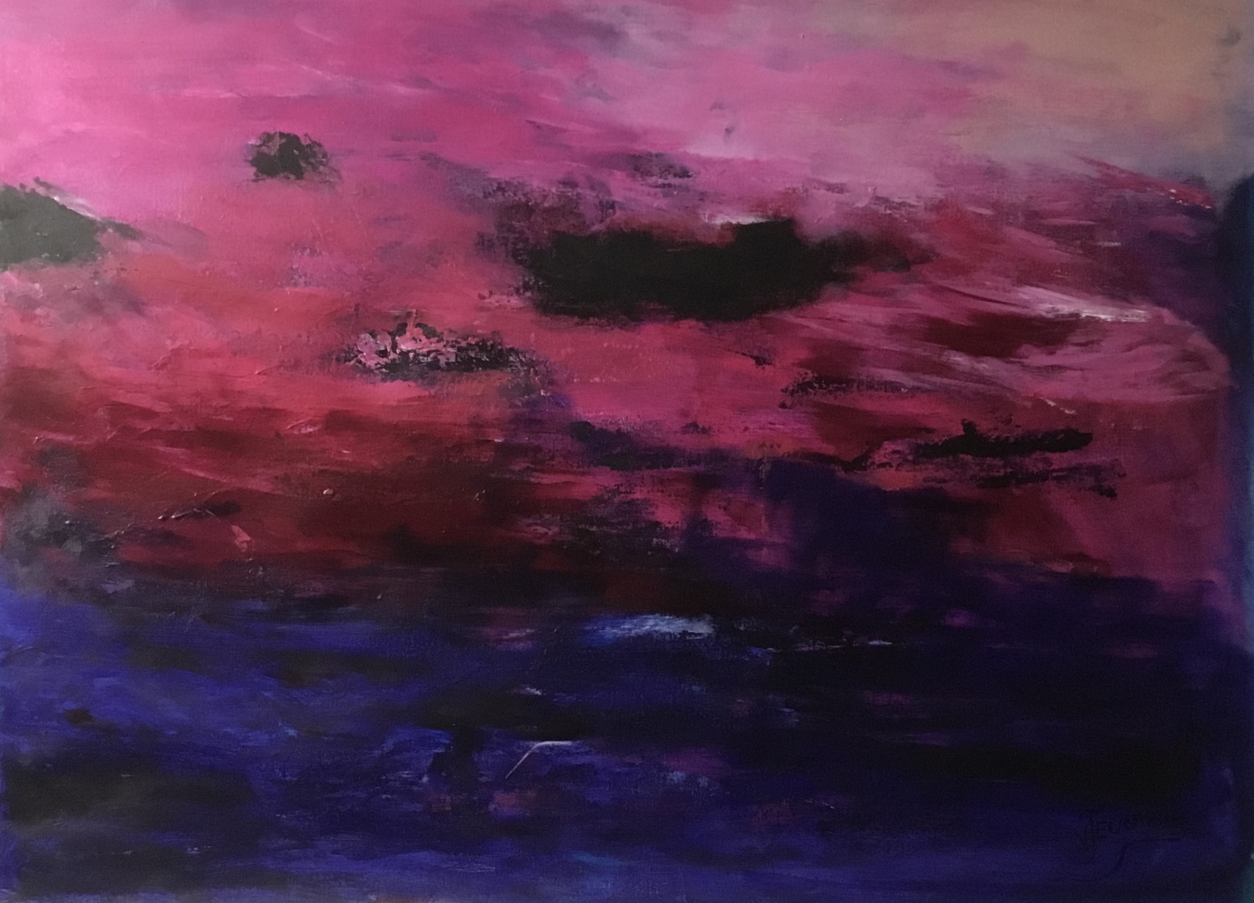 Magic Moments by Valerie Eugarde:- This is an abstract piece entirely brought about by the threatening thunderstorm which woke me with the sound of thunder shaking the house. I wanted to capture the sky and the bay with colours inspired by the dynamic conditions, I always go with the instinctive desire to reach for certain colours that reflect my feelings so I hope I have captured the intensity as I loved painting it and felt it was in tune with nature.