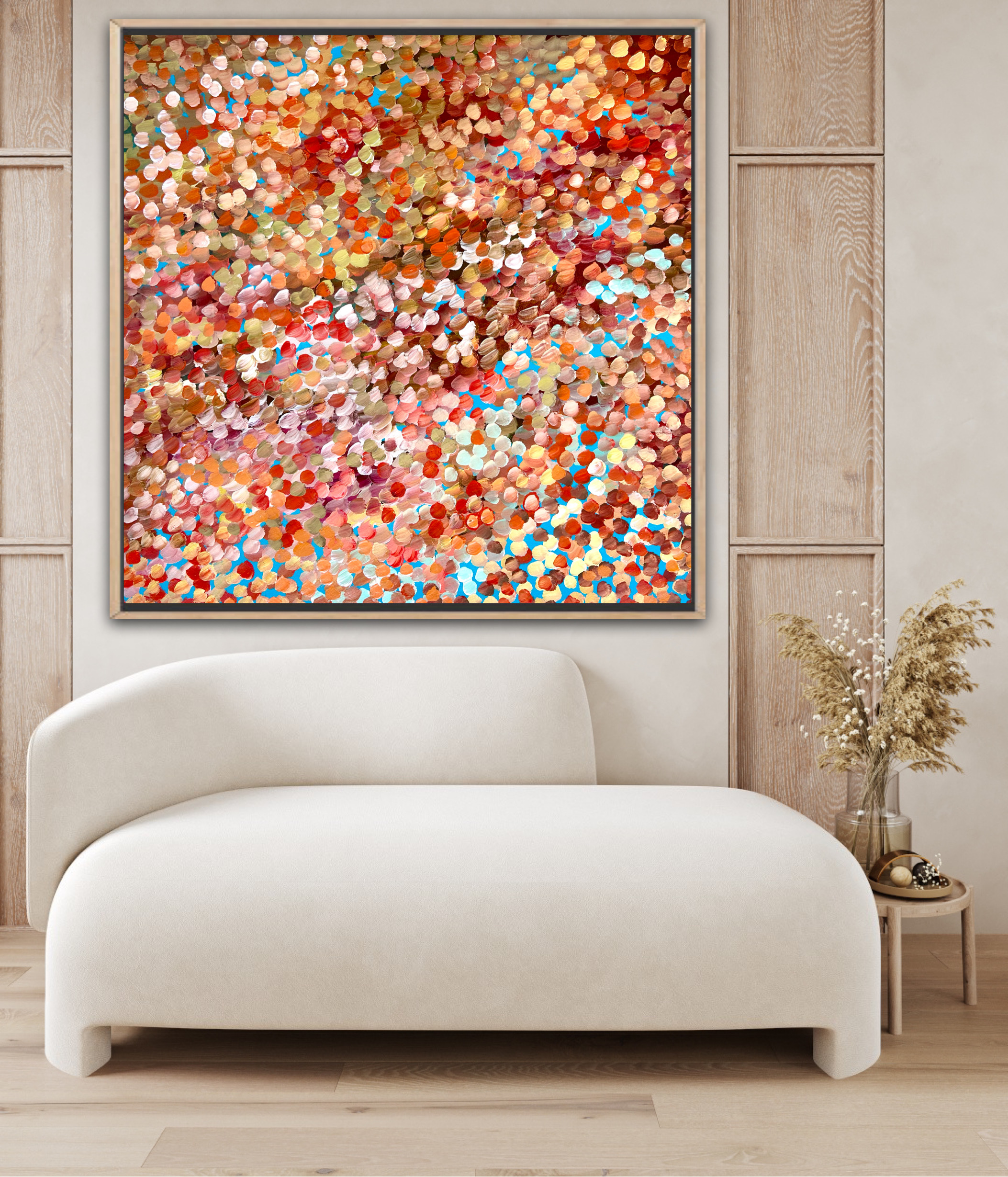 Magical Colours by Theo Papathomas a painting with warm and cool colours of petals flying in the wind creating this beautiful bouquet of petals over the lake with lots of layers of oil paint. Petals weeping over the landscape creating so much movement and rhythms . A very peaceful and tranquil painting with so much depth. The painting does not come with an external frame.The painting is signed and dated at the back and comes with a certificate of Authenticity.