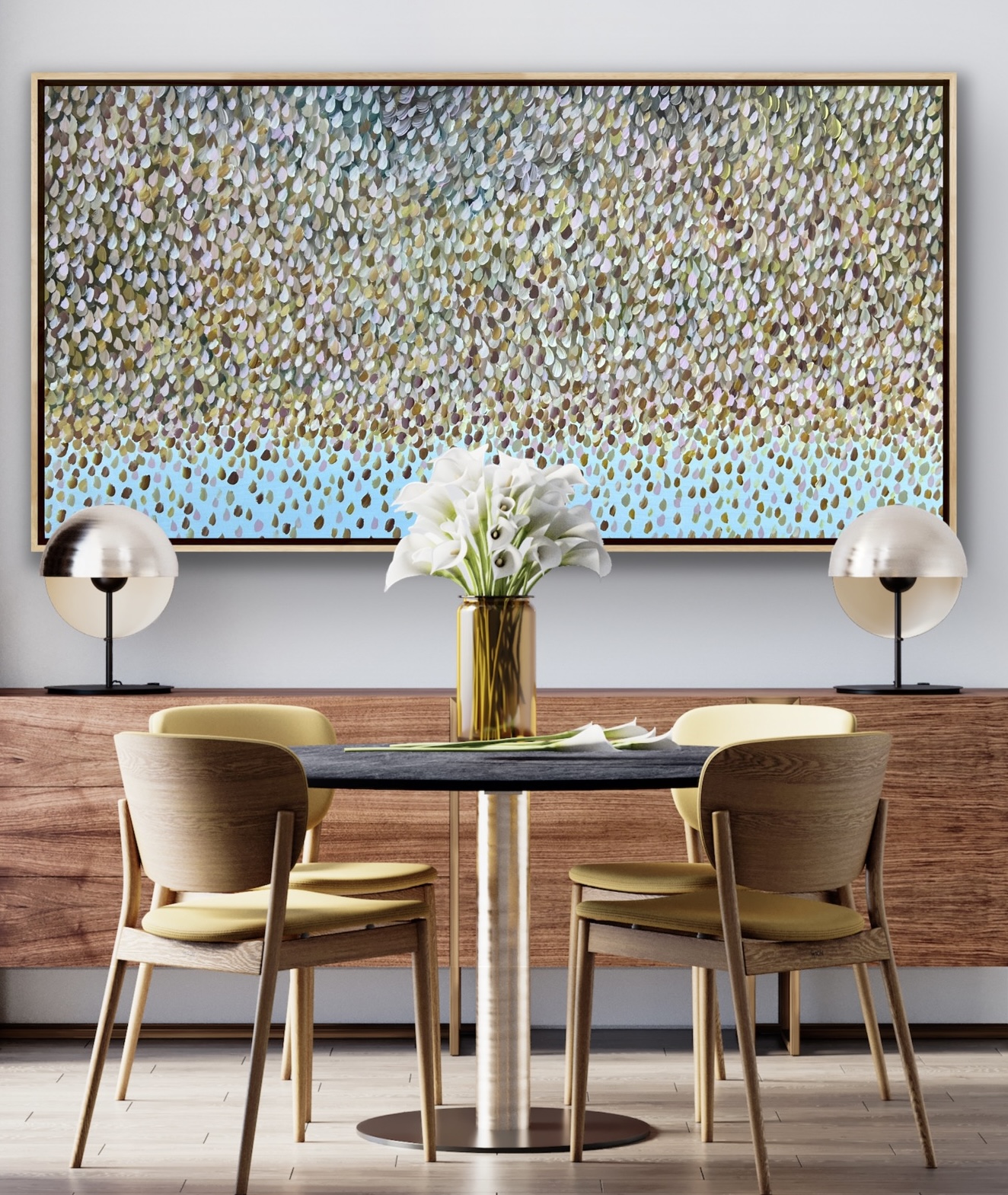 Magical Dreams by Theo Papathomas a painting with beautiful pastel colours of petals covering the landscape painted with lots of expression and freedom to create movement. Capturing the colours of the petals creating a beautiful bouquet of colours with lots of layers of paint. A composition of colours and rhythms of petals dancing over the landscape swept by the winds . A very peaceful and tranquil painting with so much depth . The painting does not come with an external frame.The painting is signed and dated at the back and comes with a certificate of Authenticity.