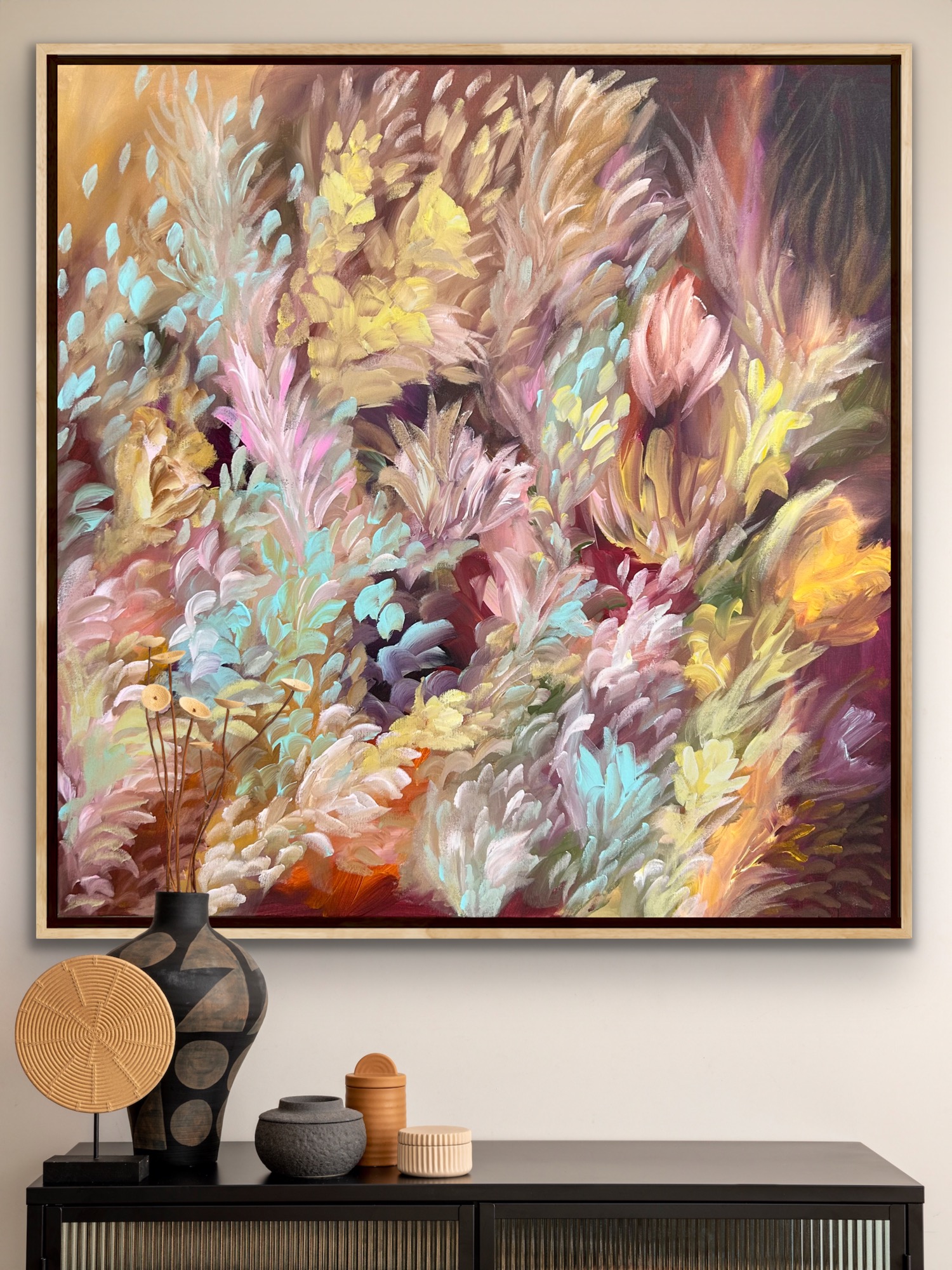 Magical Garden by Theo Papathomas a painting with warm and cool colours of the flowers and petals flying in the wind creating this beautiful bouquet of petals with lots of layers of paint. Petals weeping over the landscape creating this veil of petals with so much movement and rhythms. Petals dancing like musical notes over the garden creating a carpet of colours . A very peaceful and tranquil painting with so much depth. The painting does not come with an external frame . The painting is signed and dated at the back and comes with a certificate of Authenticity.