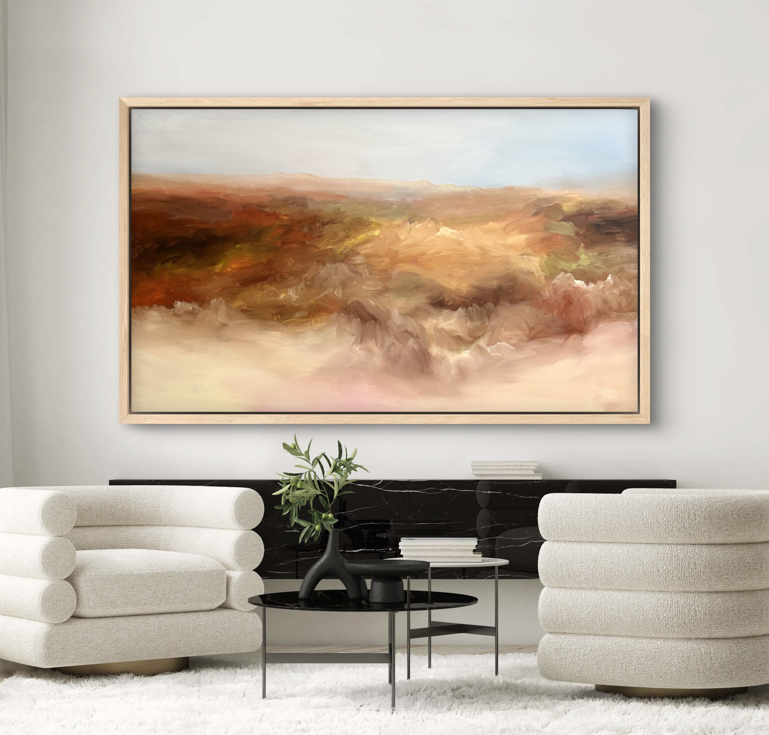 is a painting celebrating earthy colours and light of the Australian landscape. A very soothing and tranquil painting where sky, clouds, come together to create this beautiful harmonious landscape. Capturing the beautiful colours of the Australian landscape , browns, ochre and light pastels against the light colours of the sky. Clouds covering the hills and capturing the beautiful rhythms of the landscape .Painted in a very expressionistic way with acrylic paints, with lots of layers of paint . I tried to create so much depth in the painting .A very harmonious composition of colours and forms that makes it a soothing painting . This painting does not come with an external frame.The painting is signed and dated at the back and comes with a certificate of Authenticity.