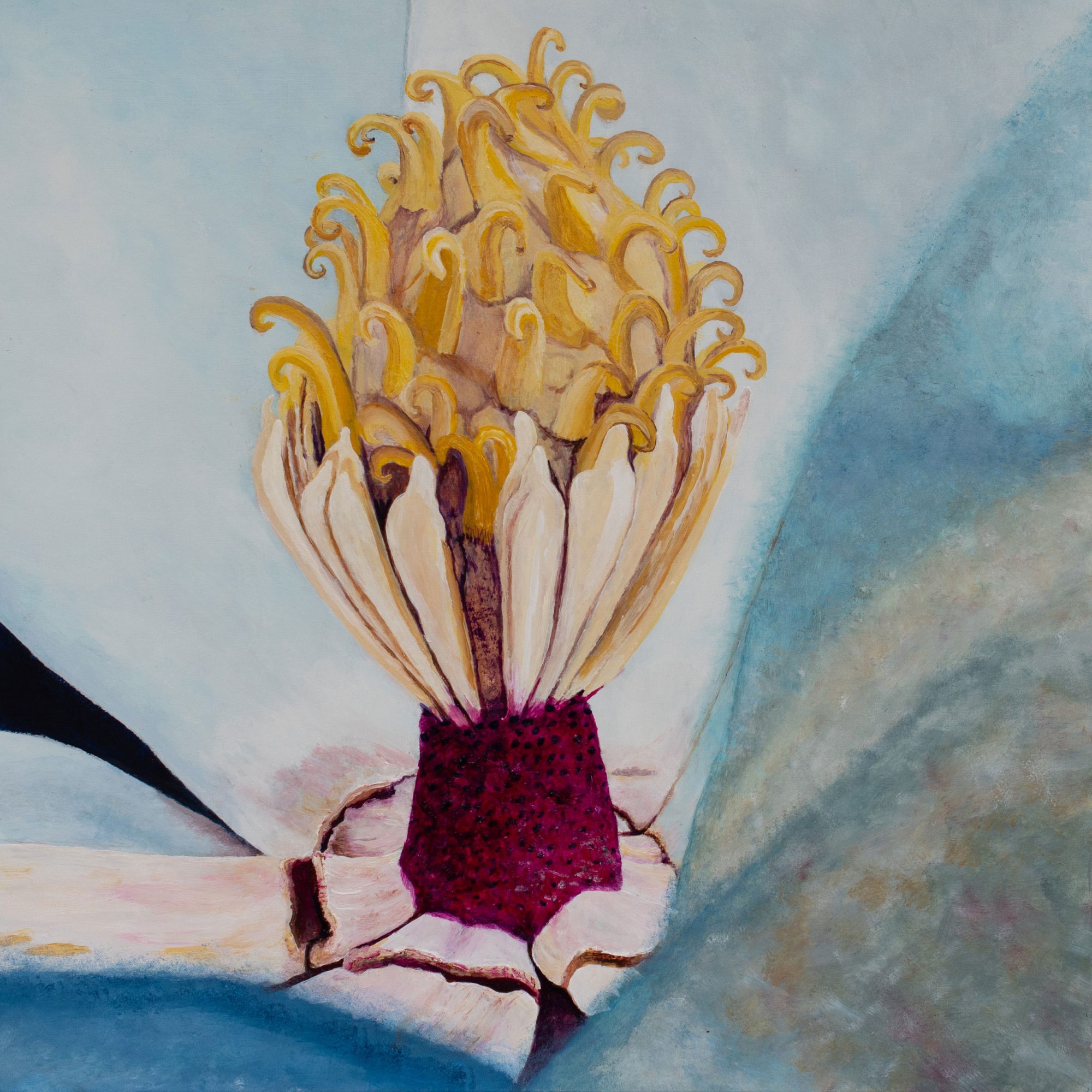 This year, as my son prepares for his HSC exams, I knew I had to paint this flower as a tribute to the skill of daydreaming. While I analysed the composition, I could sense an Art Deco design flowing from the flower’s stamens and petals. The colours of blue, gold, brown and magenta belong to an Art Deco scene. I like how the bright curled gold and yellow stigmas on the stamens contrast with the purple and magenta base of Magnolia Grandiflora.