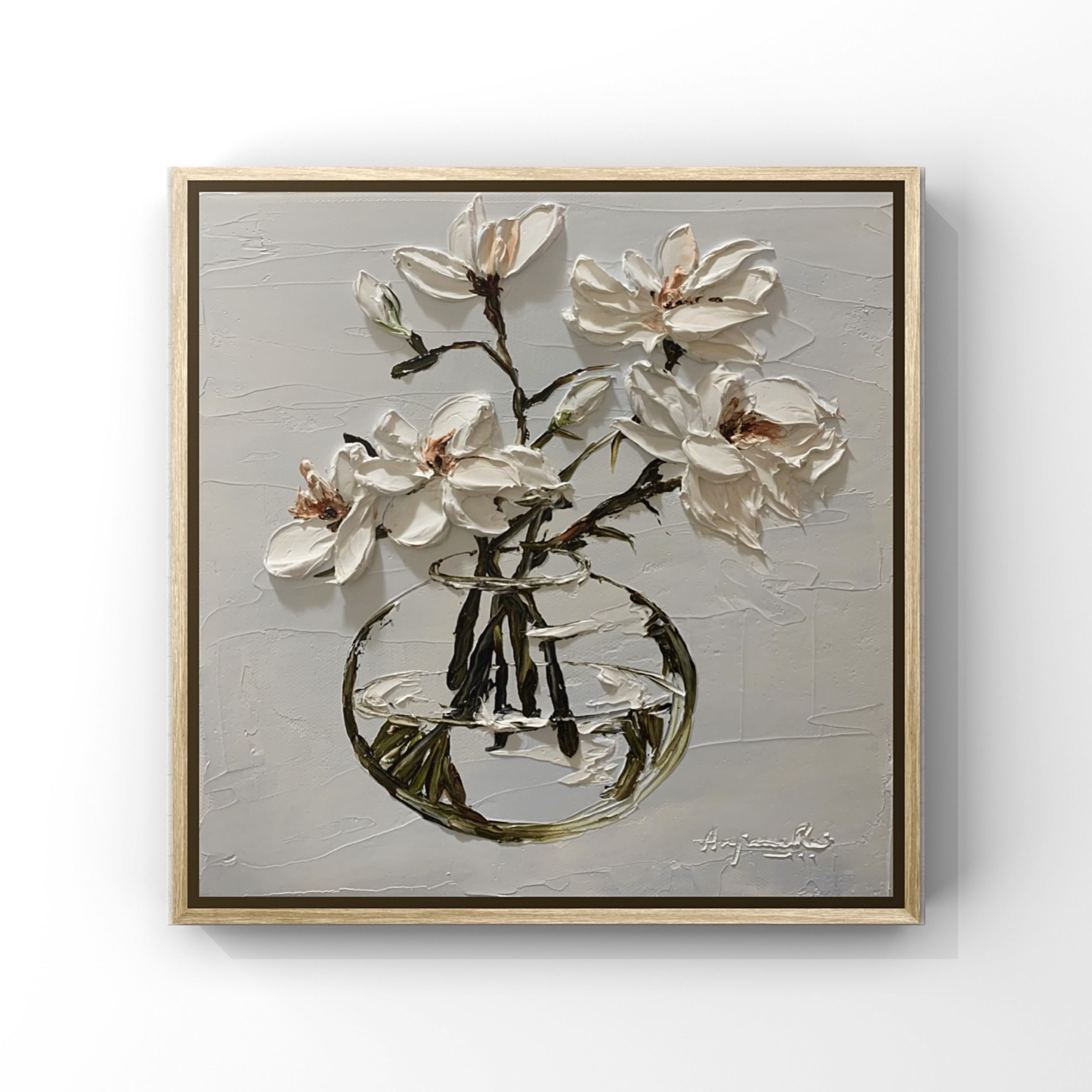 Magnolias in glass vase by Anjana Rai
