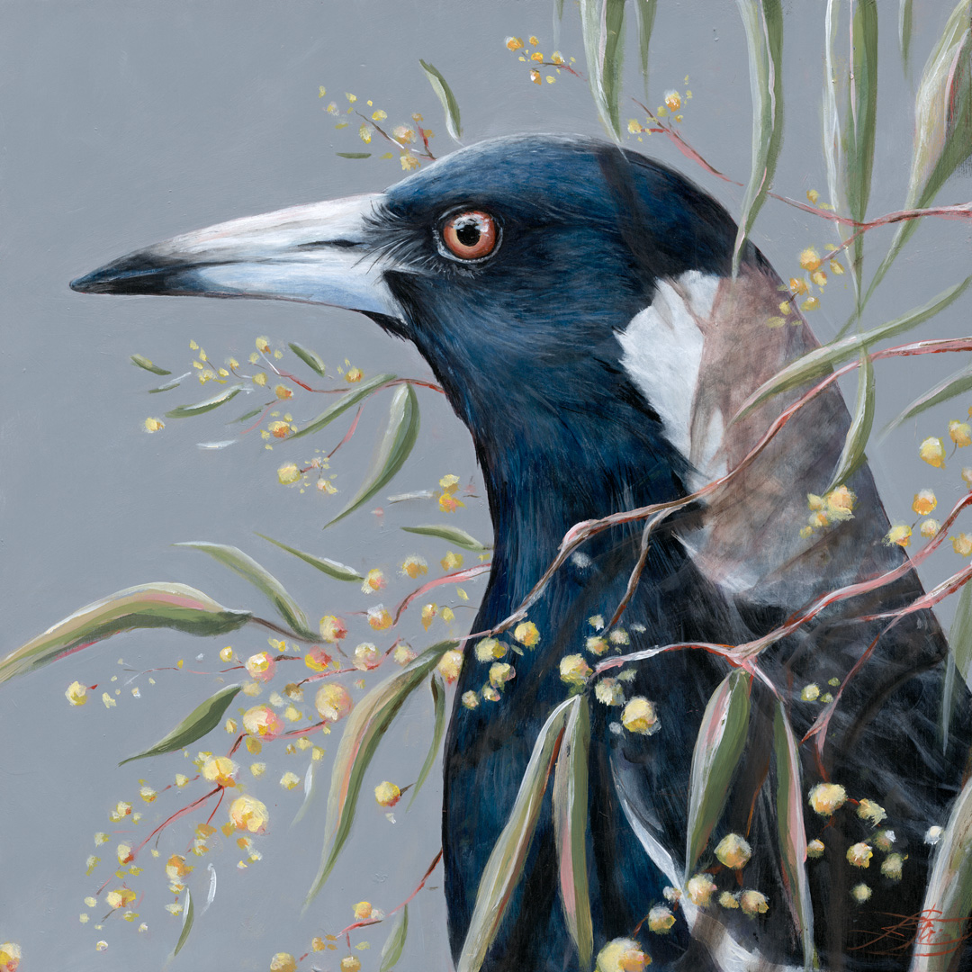 Magpie by Chad Stevens – This original painting captures the beauty of the Australian magpie, a bird known for its intelligence, curiosity, and complex social bonds. Framed by golden wattle blossoms, the magpie’s piercing gaze and bold contrast of black and white feathers stand as a symbol of resilience and connection to nature.