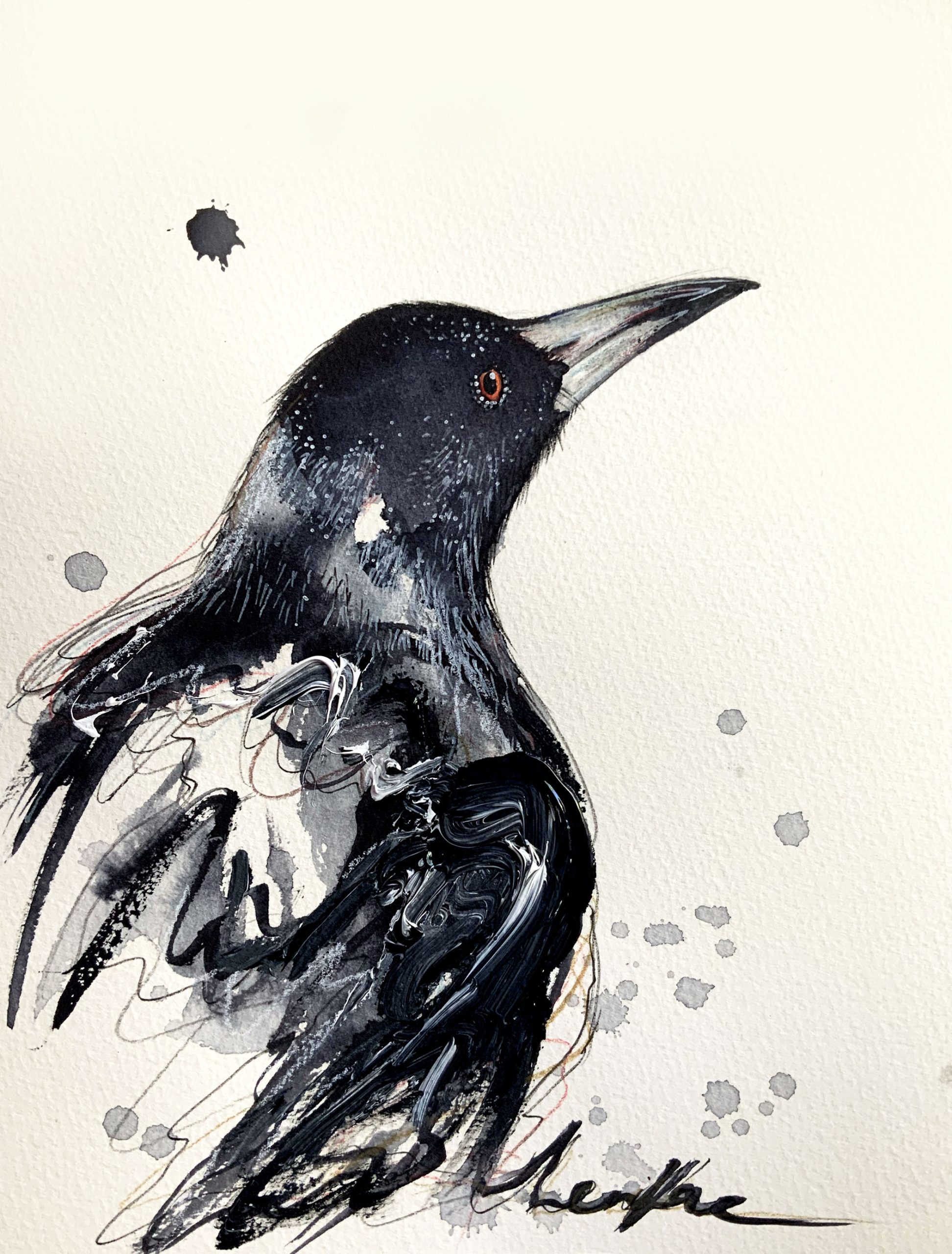 A mixed media artwork of an Australian Magpie, by Sydney artist Leni Kae from her “Animal Spirit” series. The magpie here looks ahead with powerful new wisdom. It is ready to apply its spirit moving forward with insight and resourcefulness. The Magpie awakens souls; challenging the seeing of self-truth, and the truths of the world around it. This includes the ‘black and white’ as well as the grey in-between.